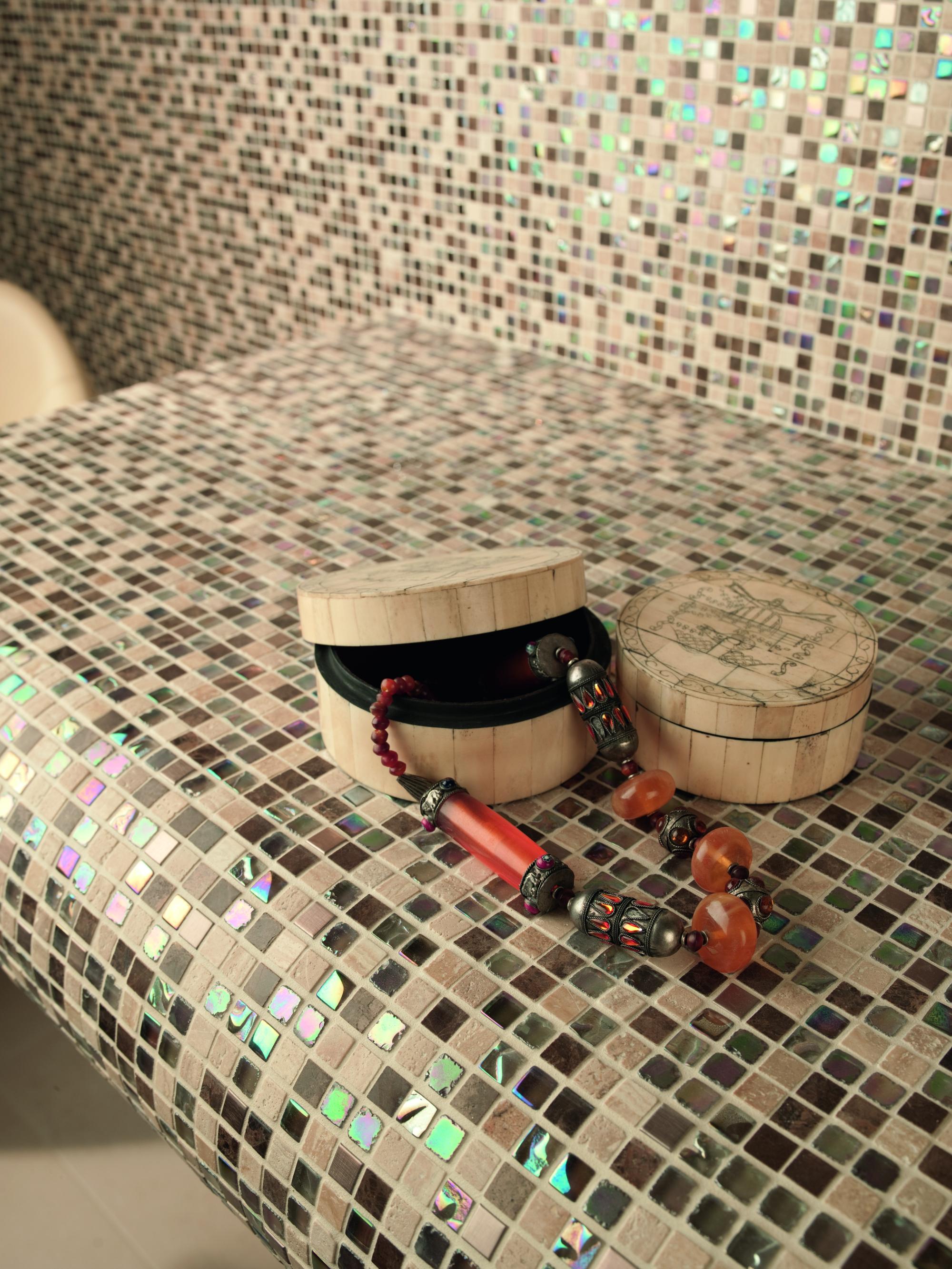 Mixed materials mosaic in dark and iridescent creamy colours.