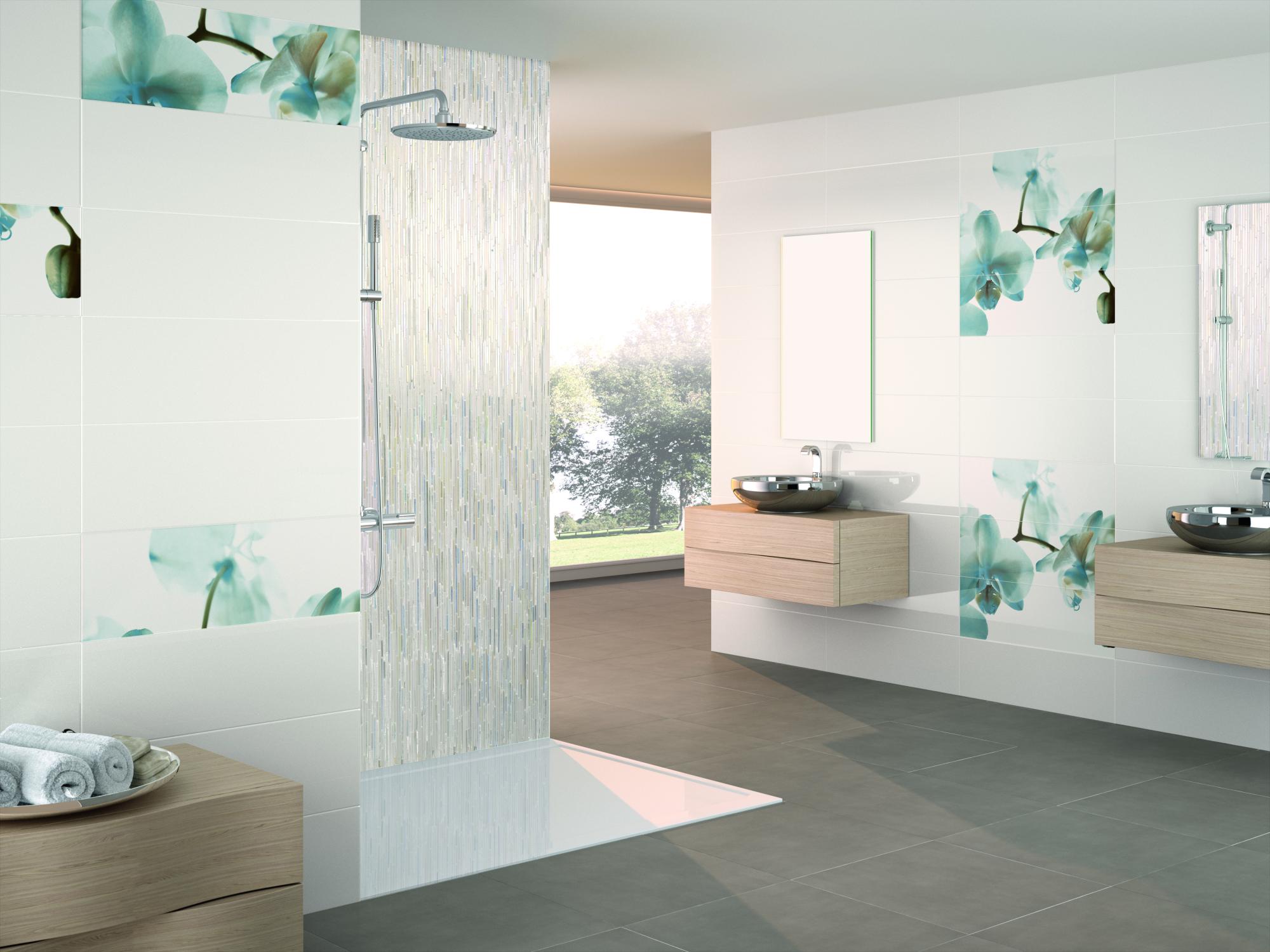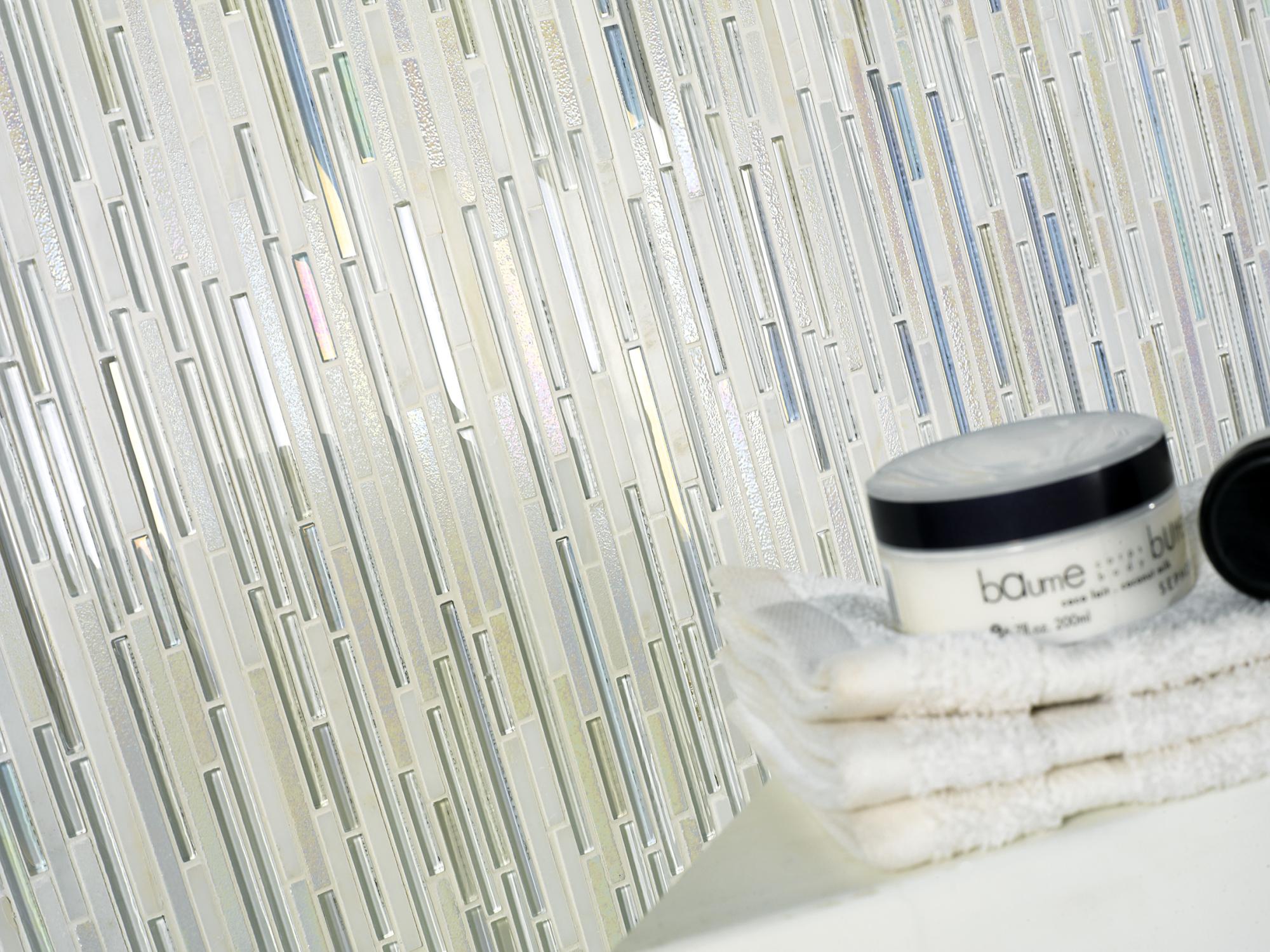 Stone and glass mosaic with white iridescence.