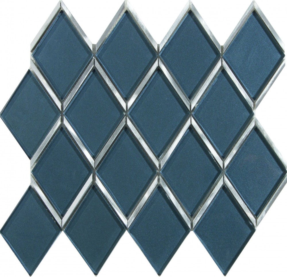 Rete di vetro con tessere a forma di rombo in color blu di Francia. Ogni tessera è bordata da un sottile profilo in acciaio inossidabile argentato che esalta la profondità del vetro.
