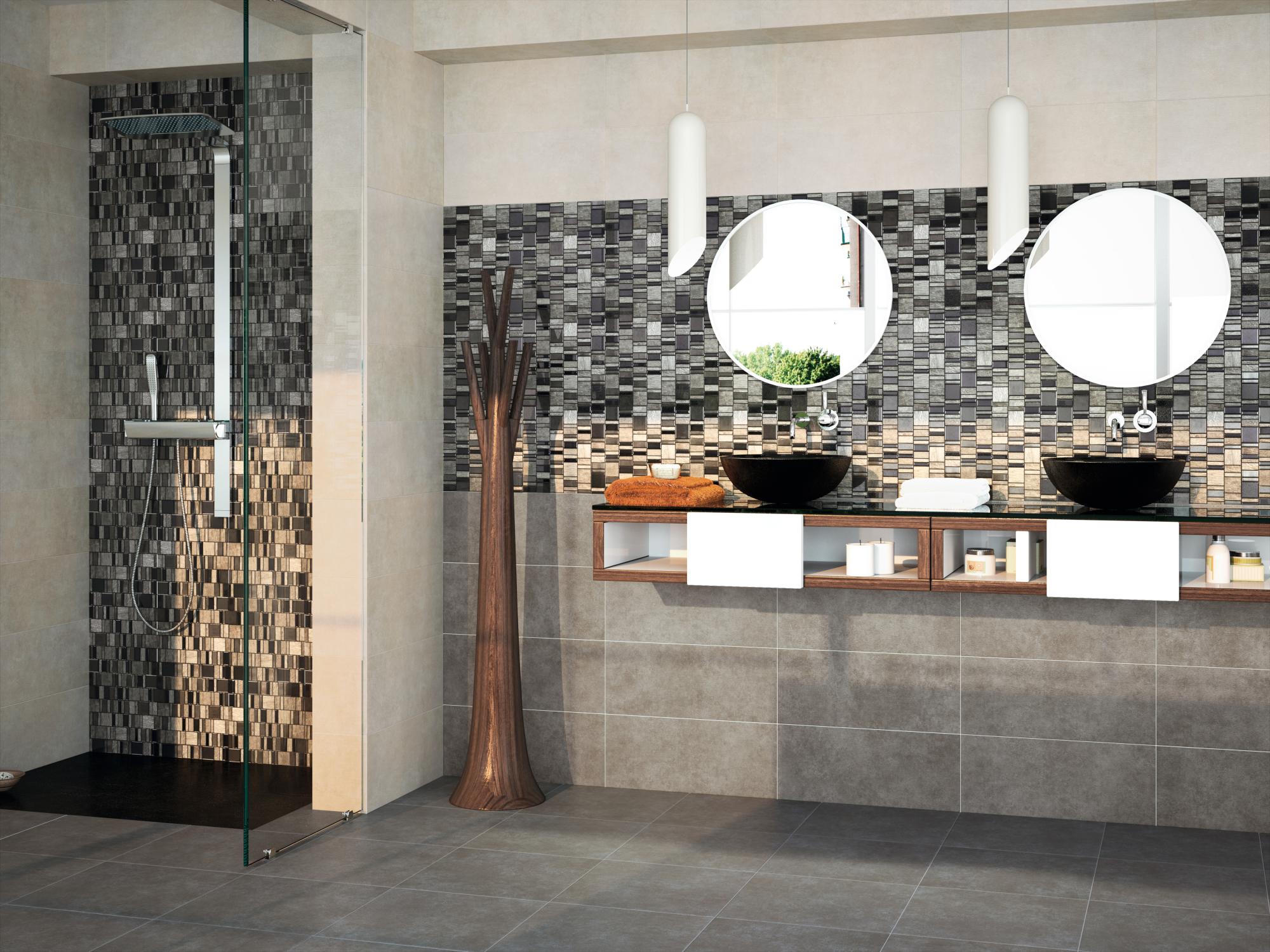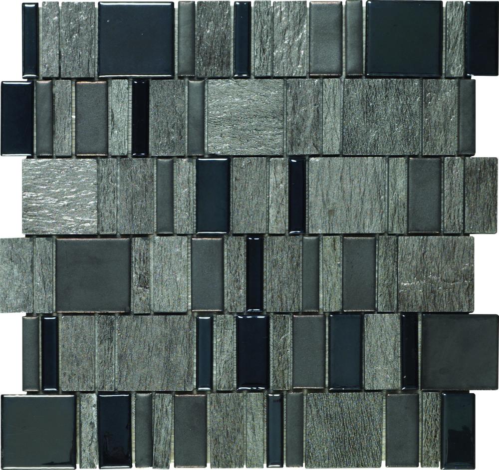 Moderno mosaico in tonalità grigie e nere, combina tessere di diverse dimensioni in pietra e vetro. Facilissimo da abbinare, è un mosaico perfetto per risaltare determinate aree nel rivestimento di spazi pubblici e privati.