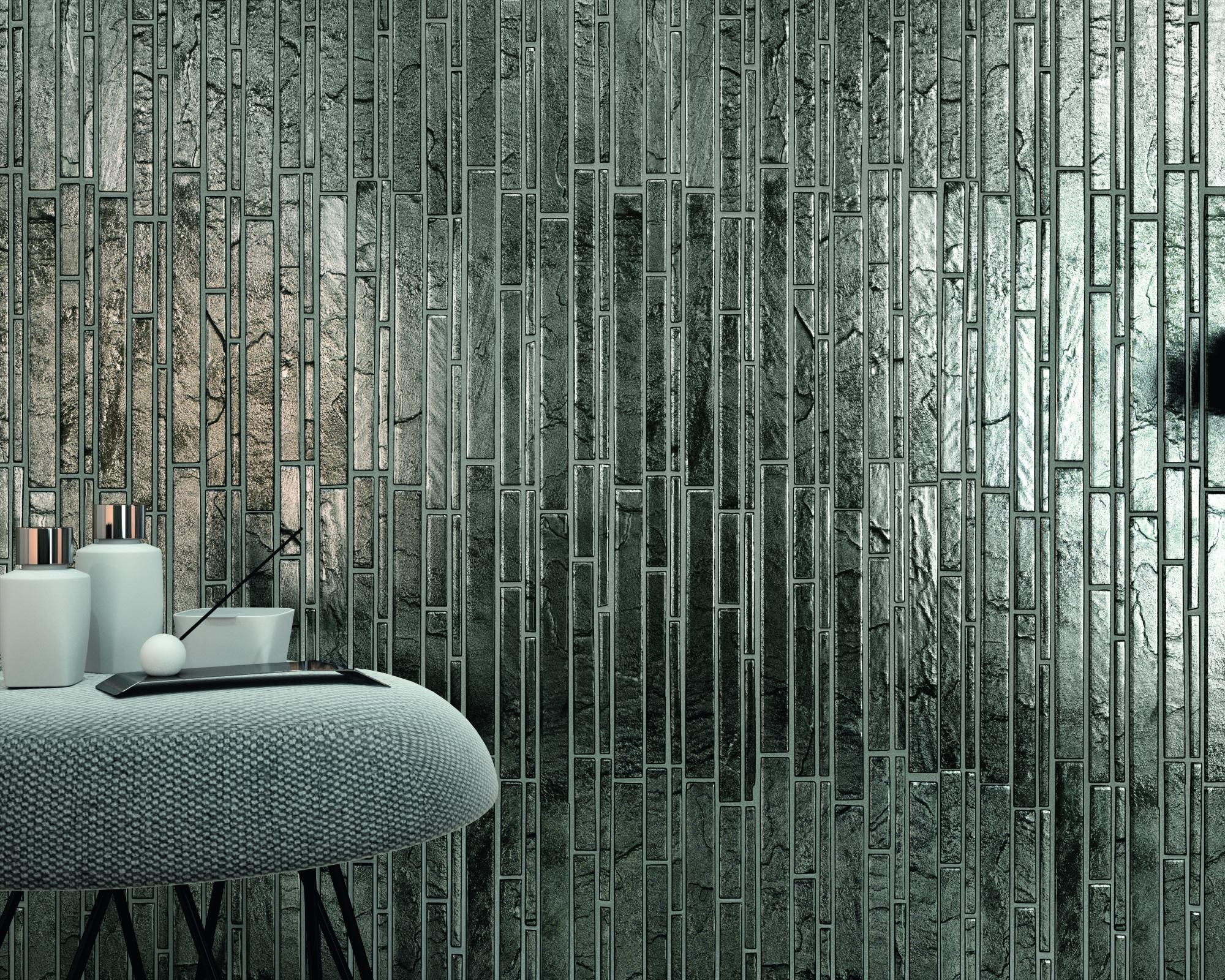 Sandstone mosaic, coated with silver-toned metallised paper and a thick layer of resin, providing depth. Handcrafted for sumptuous and out-of-the-ordinary decorations.