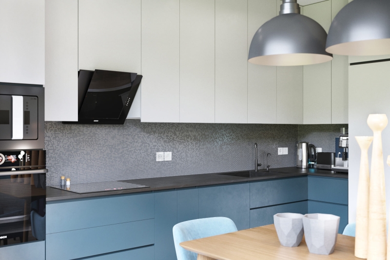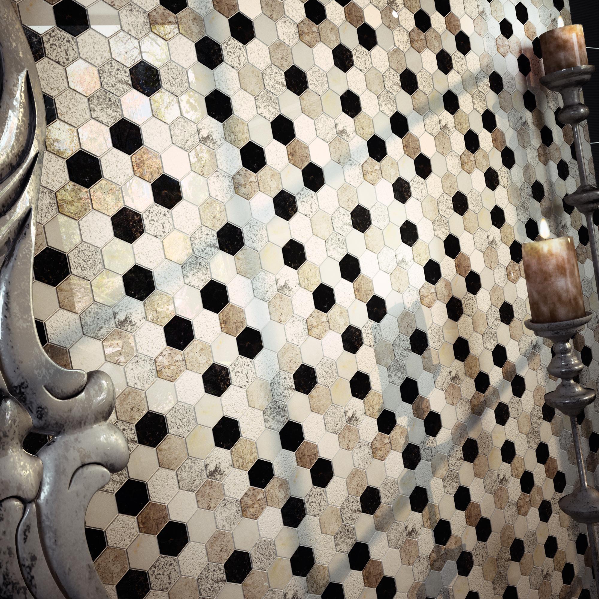 Elegant hexagonal mosaic rich in finishes. It combines black, grey and white marbles creating a modern concept.
