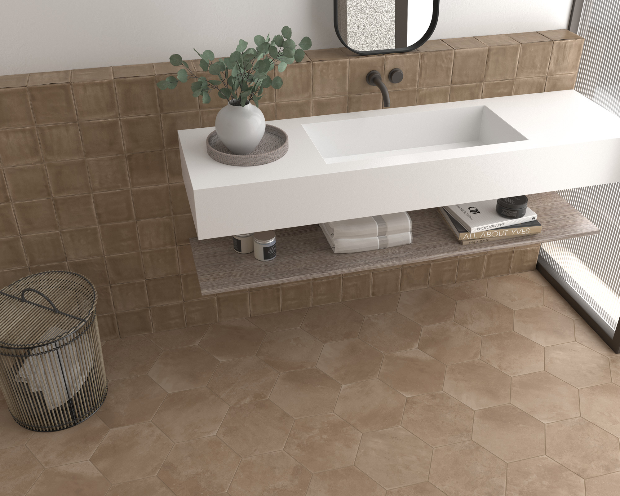 Rivestimento quadrato formato 12,5×12,5 cm con una texture marcata che imita il lavoro manuale dell’argilla e una setosa finitura opaca tipo “eggshell”. In questa tonalità Cacao esprime profondità e personalità, arricchendo le superfici con un tono terroso scuro che sottolinea il carattere artigianale del rilievo. Perfetto per combinazioni dal carattere deciso.