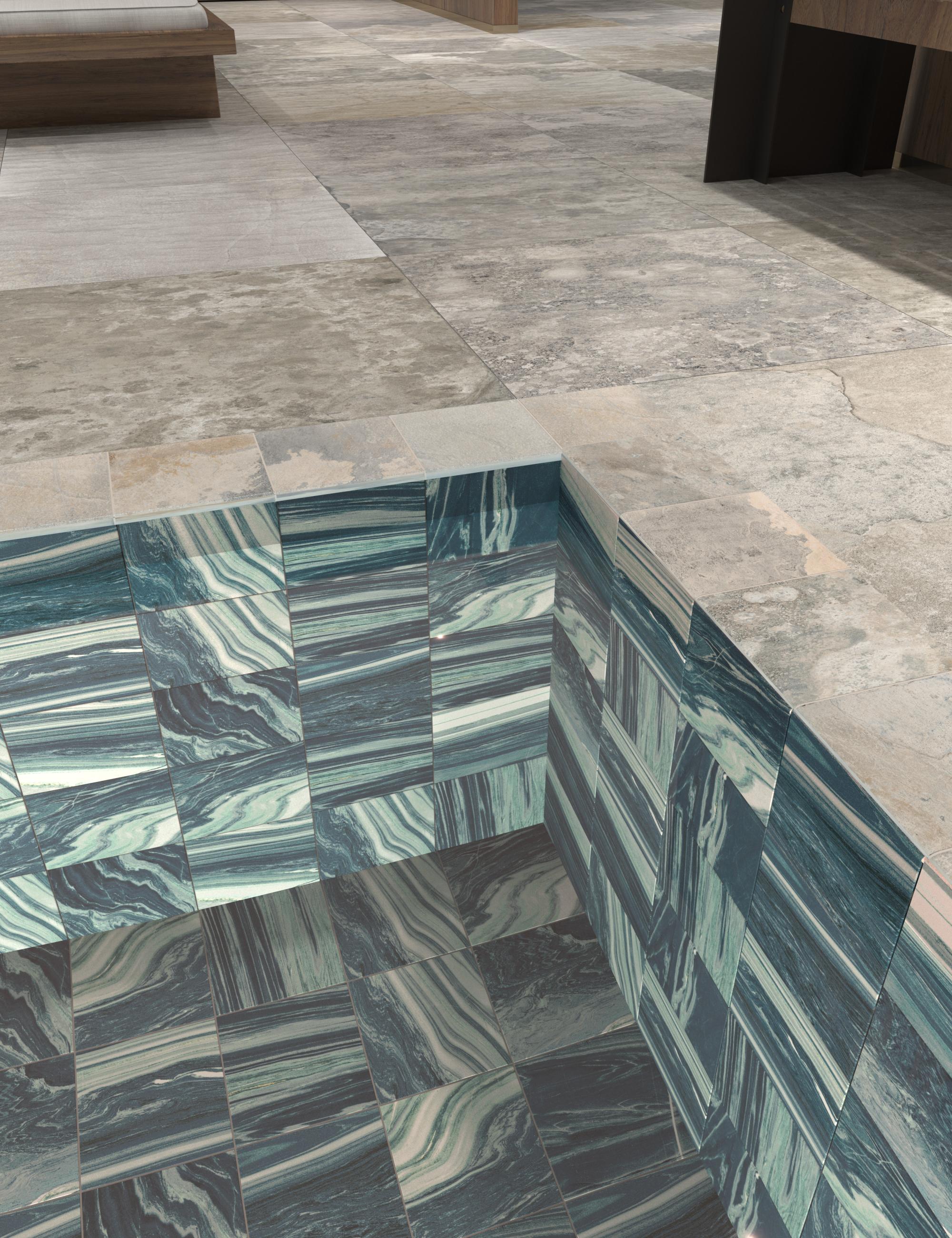 Piastrella in porcellanato nel formato 14,7x14,7 cm che cattura l'essenza delle pietre semi-preziose in una tonalità blu profonda e sofisticata, ideale per chi desidera aggiungere un tocco di eleganza audace ai propri spazi. Ispirata alle linee e alle forme delle onde del mare, la sua grafica unica crea una sensazione di movimento e profondità, mentre la finitura satinata offre una superficie piacevole al tatto e visivamente d'impatto.