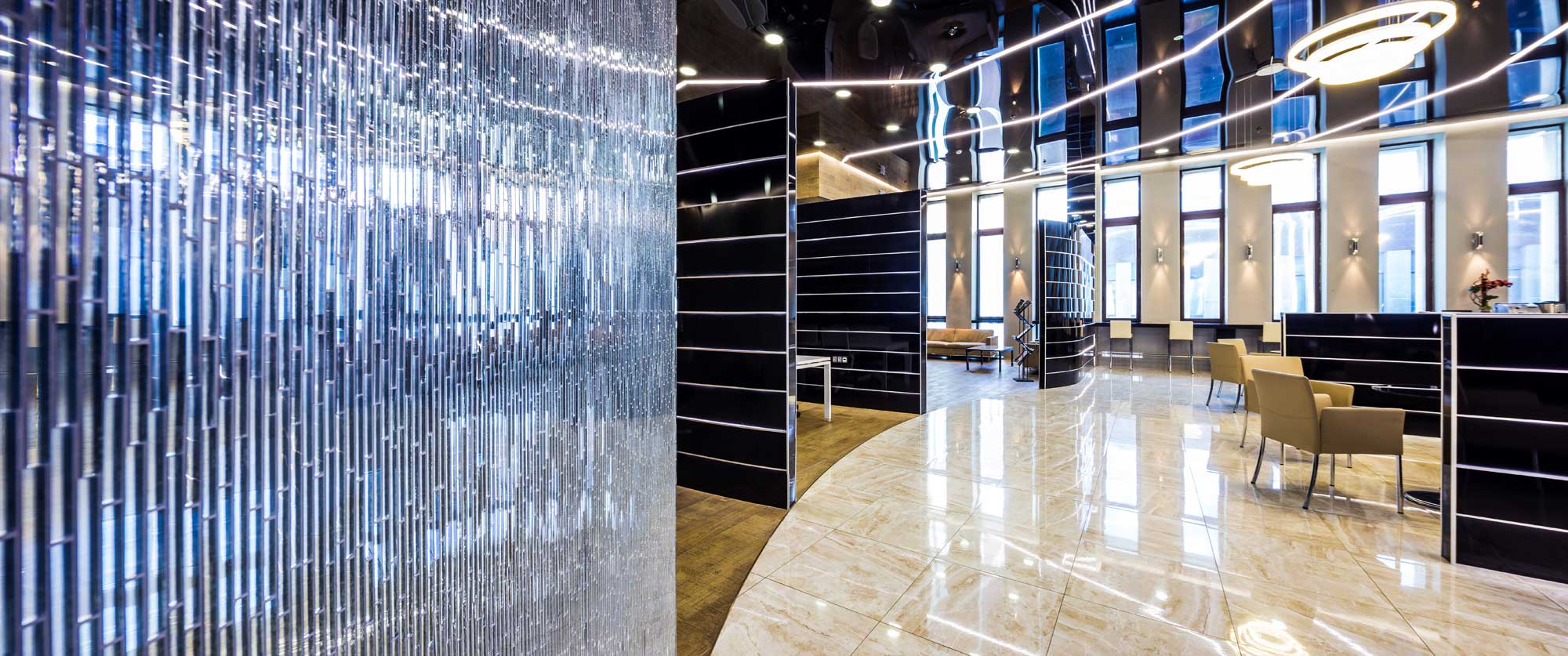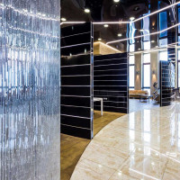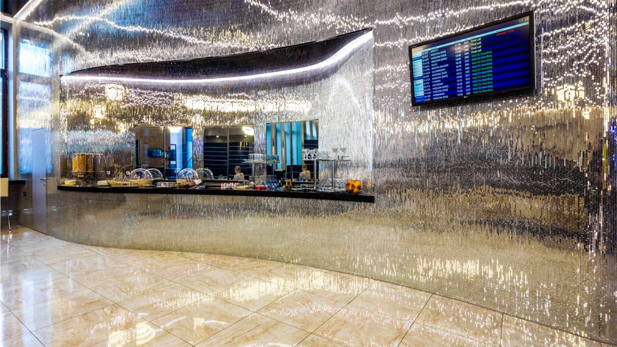Insomma, la nuova business lounge dell'aeroporto russo presenta un'immagine rinnovata in cui il colore nero dei rivestimenti si sposa perfettamente con il marmo e il legno. Inoltre, la stanza ha un'illuminazione squisita che massimizza l'estetica di questo posto di lavoro. Come l'elemento più impressionante, troviamo varie pareti rivestite con il nostro modello Glass Mirror.