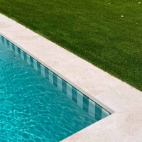 L'elemento più caratteristico del progetto è il rivestimento ceramico che ricopre sia la vasca della piscina che la panca rialzata, realizzato con i modelli Greenland Frost e Greenland Teal. La combinazione di queste due tonalità permette di creare un linguaggio visivo ricco ed equilibrato, in cui il contrasto tra la luminosità del Frost e l'intensità del Teal genera profondità e dinamismo. Il motivo geometrico, basato su strisce verticali, crea un effetto visivo dinamico che ricorda i motivi tradizionali reinterpretati in chiave contemporanea. Questo gioco di linee conferisce ritmo e profondità, trasformando le superfici in piani vivaci che cambiano a seconda dell’incidenza della luce. L’acqua funge da amplificatore visivo, intensificando le tonalità e creando riflessi in movimento che arricchiscono l’esperienza sensoriale dello spazio.