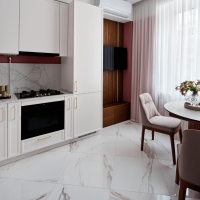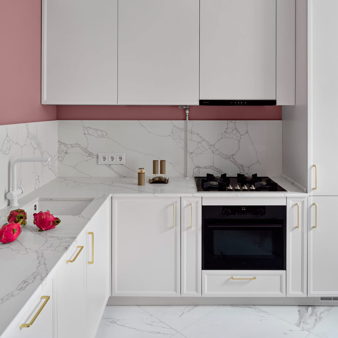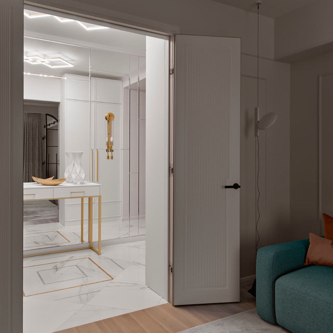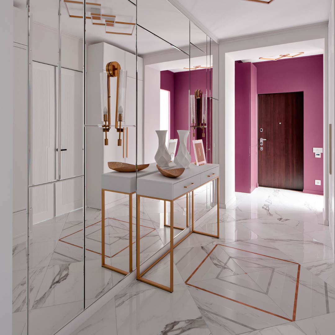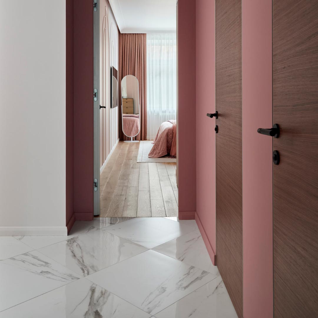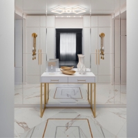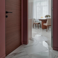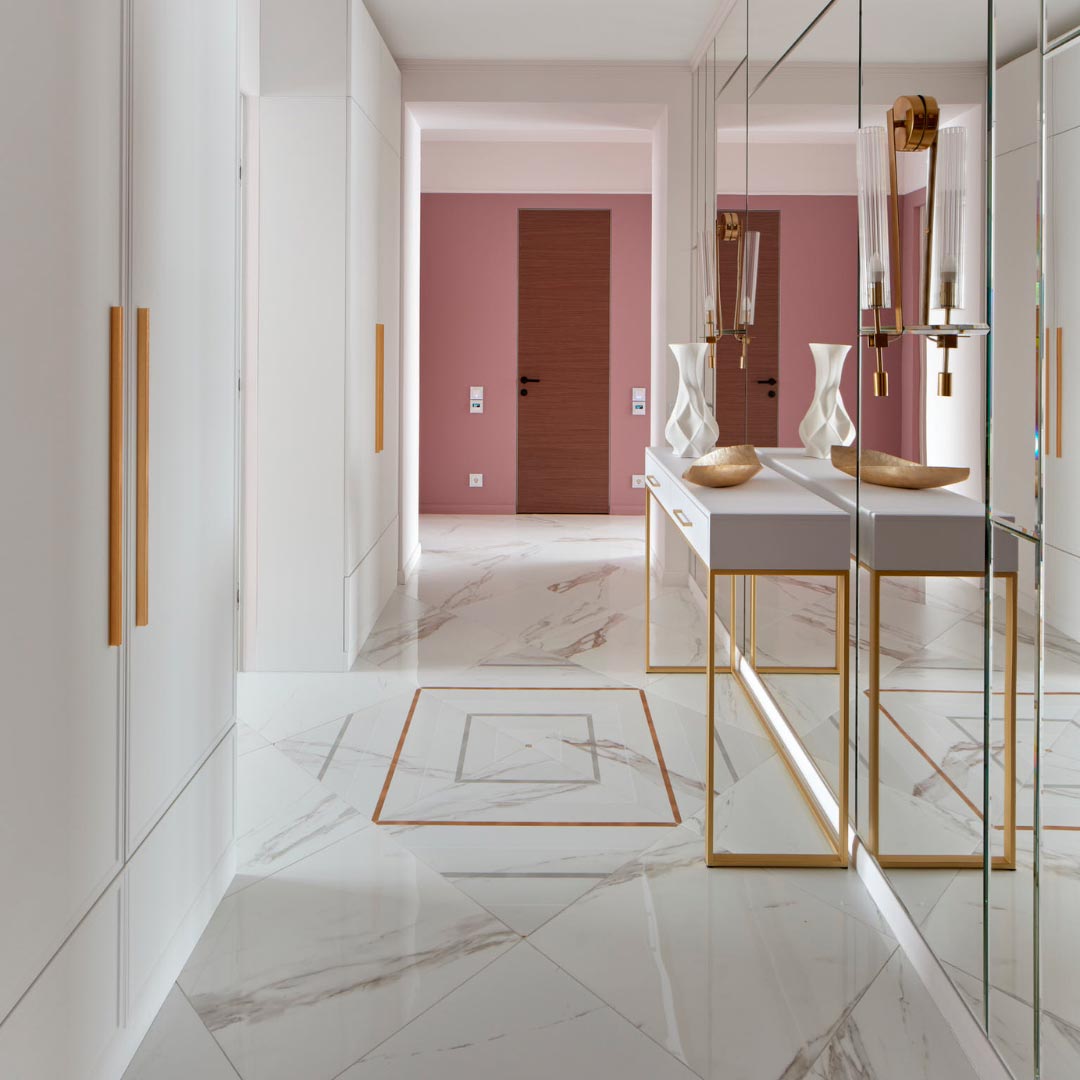 Qui, i nostri gres porcellanati della serie Calacatta sono diventati una parte fondamentale di questo concetto. Le piastrelle CALACATTA SUPERWHITE SATIN 60X60 e CALACATTA SUPERWHITE 60X60 sono protagoniste nella pavimentazione della cucina e dell’ingresso. La combinazione di superfici in gres porcellanato opache e lucide, texture tattili e venature marmoree intense esalta alla perfezione la fusione tra classico e moderno. Inoltre, la decorazione Calacatta Bella Satin si inserisce splendidamente nella parte centrale dell’ingresso. L’effetto pietra naturale e la linea decorativa dorata rafforzano l’idea di una palette tranquilla e sobria, conferendo stabilità e nobiltà all’interno.