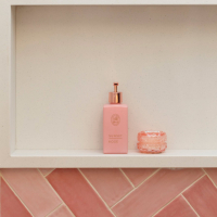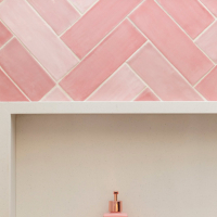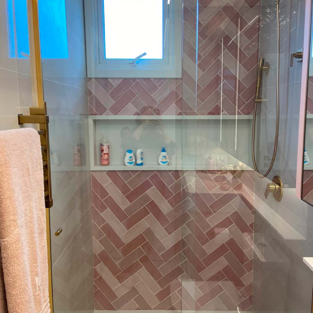 Uno degli elementi chiave del progetto è l’utilizzo del nostro rivestimento Tabarca Rosa, una piastrella ricca di carattere, con sottili variazioni cromatiche e una finitura lucida che dona dinamismo e leggerezza visiva. La posa a spina di pesce valorizza il gioco di luci e ombre, generando profondità e movimento sulle pareti della zona doccia.