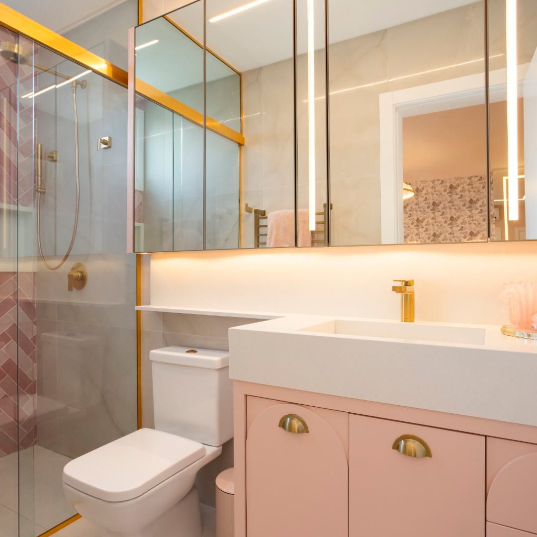 La funzionalità resta sempre al centro del progetto. Lo specchio integra un mobile contenitore incassato con illuminazione frontale, una soluzione pratica che ottimizza lo spazio e mantiene un’estetica leggera e ordinata. La rubinetteria e i profili con finitura dorata aggiungono un tocco elegante e sofisticato, bilanciando la dolcezza cromatica con un linguaggio contemporaneo.