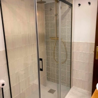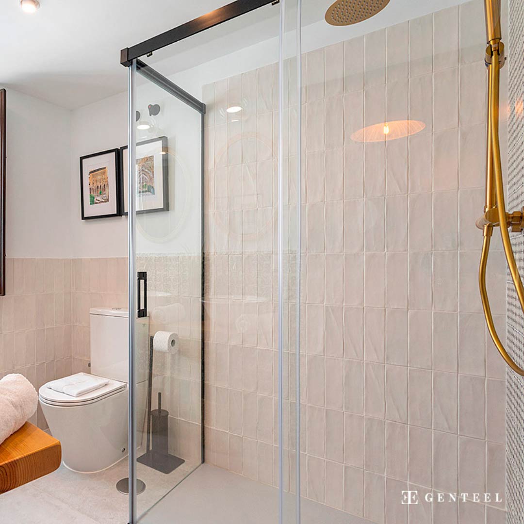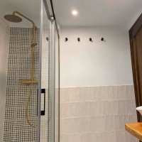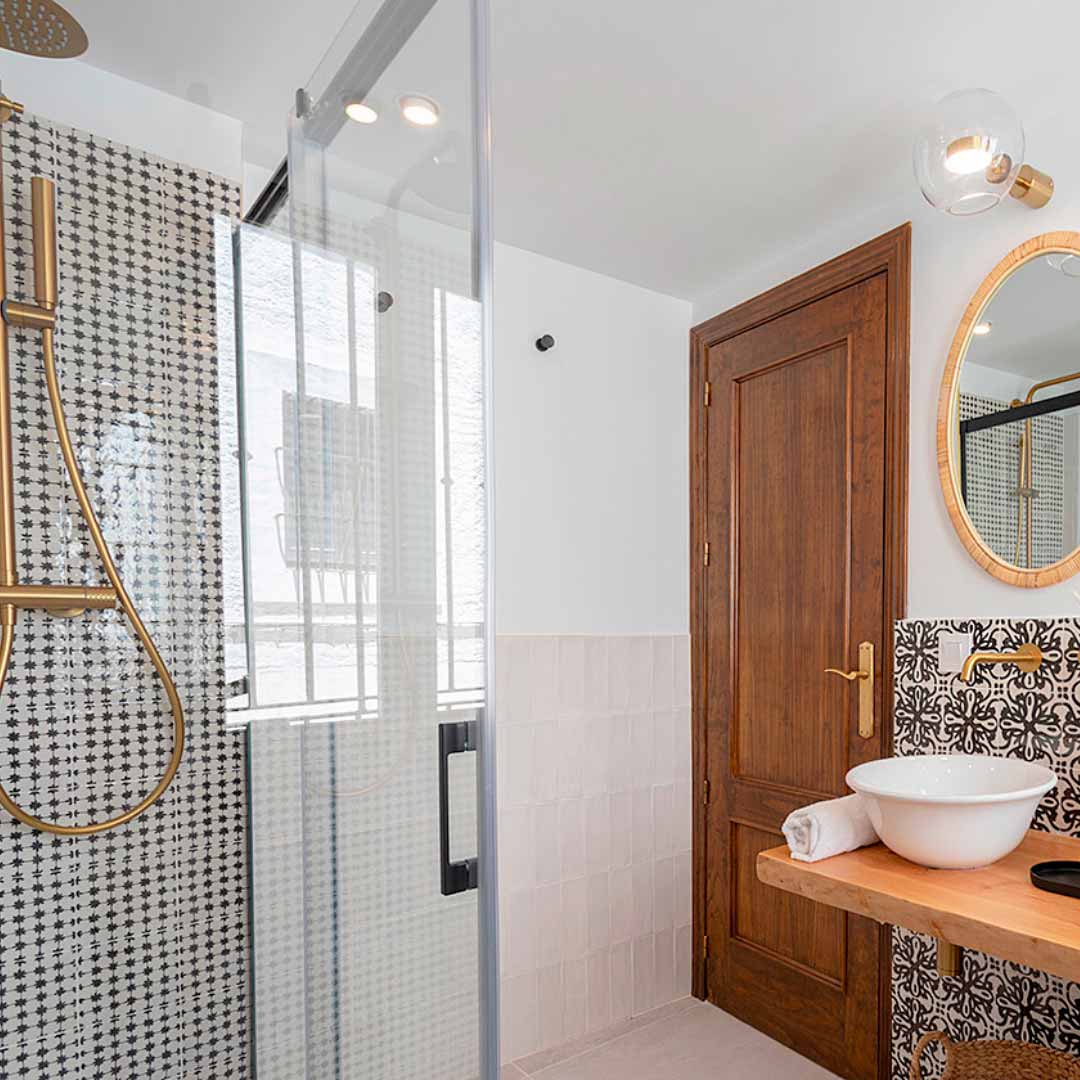 Nel bagno, invece, il nostro pezzo Tabarca Matt White è il complemento perfetto per il rivestimento della doccia, caratterizzato da un motivo geometrico. Ancora una volta, le nostre piastrelle forniscono quell'equilibrio e quel contrasto visivo con le piastrelle decorate, tra il decorativo e il fascino semplice del rustico.