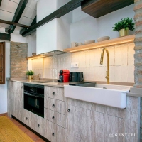 La disposizione regolare e simmetrica delle piastrelle crea un senso di ordine e pulizia, mentre la texture e i toni tenui conferiscono calore allo spazio. A livello visivo, le piastrelle sono anche in armonia con le travi a vista del soffitto, che aggiungono un tocco rustico alla cucina. Qui le nostre piastrelle in gres porcellanato Agadir giocano un ruolo fondamentale nel mantenere l'equilibrio estetico tra tutti gli elementi che compongono la cucina.