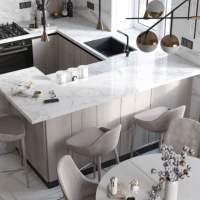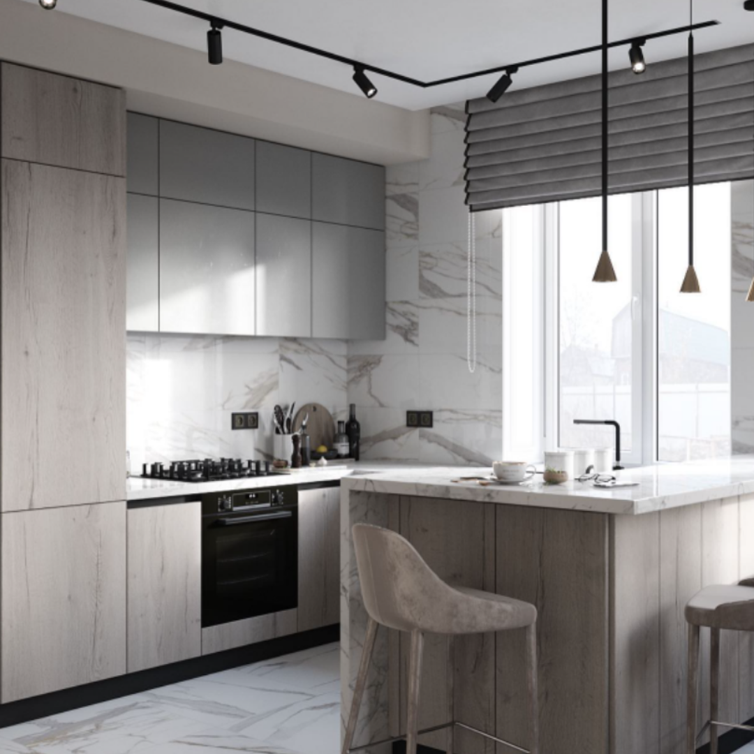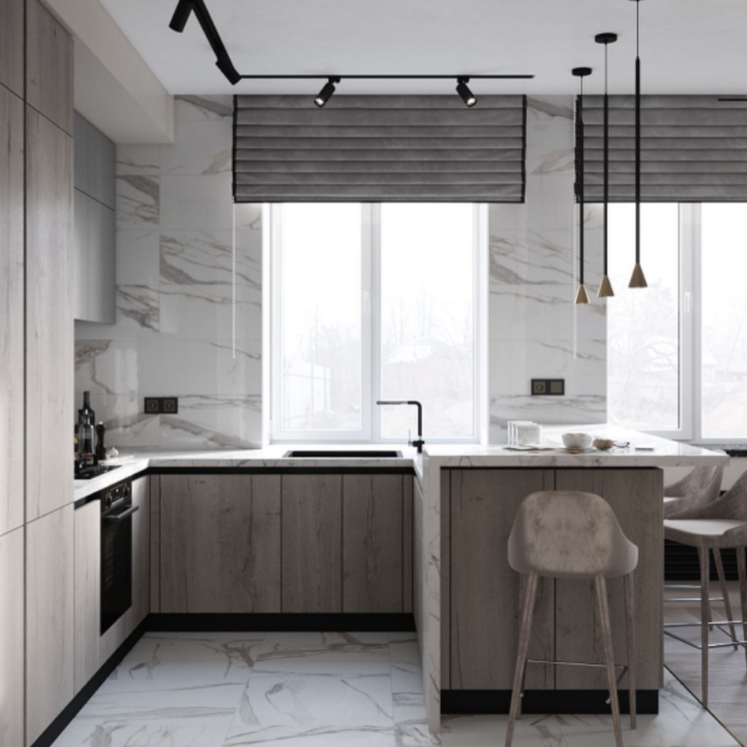 In particolare, Maria Sofronova ha scelto la piastrella Calacatta Lux per il rivestimento della zona cucina. Questa elegante piastrella marmorizzata, nel formato 30x90, si distingue per il suo colore bianco con venature marcate, che conferisce ai pezzi una grande ricchezza grafica.