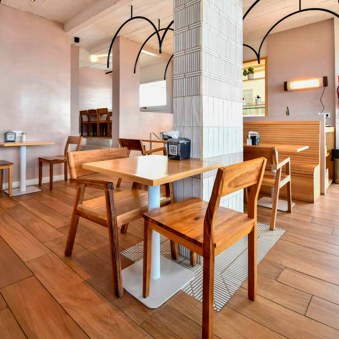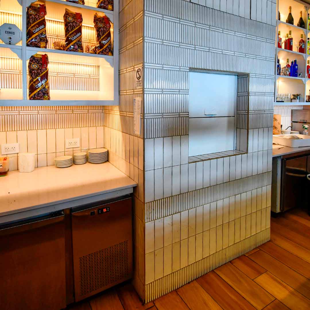 Il bianco è stato applicato alle pareti con una combinazione della nostra Tabarca Blanco in formato 7,5x23 cm e di una piastrella effetto dito che conferisce dinamismo e vitalità all'intera pelle che riveste questa fantastica caffetteria. Per il pavimento e gli arredi è stato scelto il legno, per ottenere quel tocco piacevole e accogliente che invita a entrare.