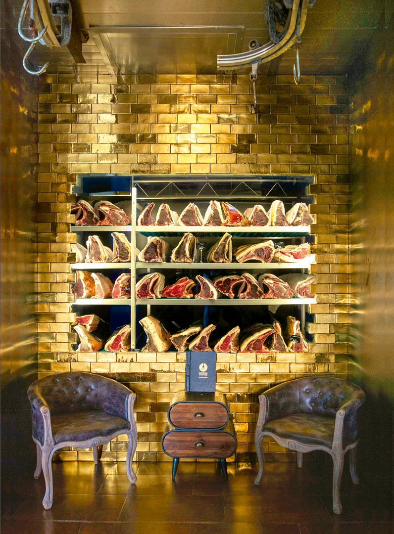 All'interno del ristorante si respira un'atmosfera sobria ed elegante che si sposa perfettamente con il prodotto gourmet offerto da Instinto Carnívoro. Il cliente può visionare i tagli di carne grazie ad una vetrina in cui sono esposti i prodotti. Per completare la qualità dei pezzi, non c'è niente come rivestire lo spazio con il mosaico Grace, un pezzo che trasuda eleganza e un tocco chic grazie alla sua finitura PVD oro.