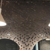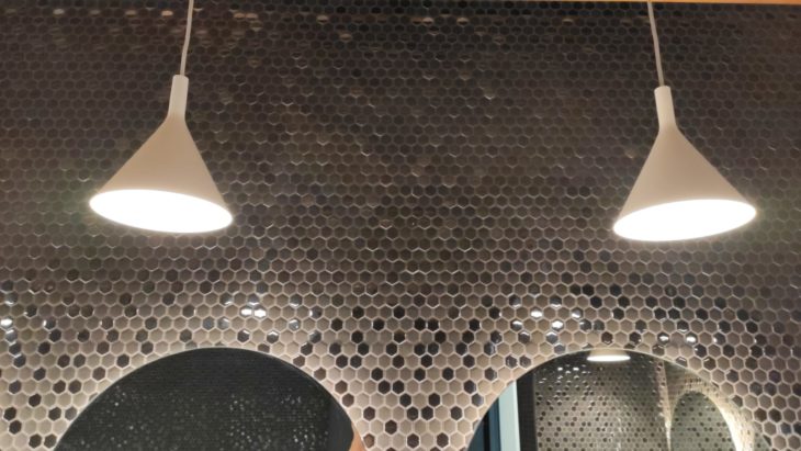 Tutto sommato, questo pezzo della nostra collezione contract si inserisce perfettamente nei bagni del nuovo spazio. Questo mosaico esagonale dai toni scuri che rasentano il nero unisce ed esalta le figure sul pavimento con una finitura in marmo, i lavabi rotondi e gli specchi. Allo stesso modo, le doghe di legno poste sul soffitto della stanza si combinano millimetricamente con il pezzo di ceramica, donando calore e stile ai nuovi bagni.