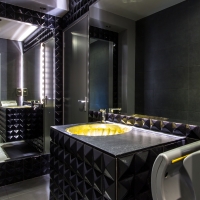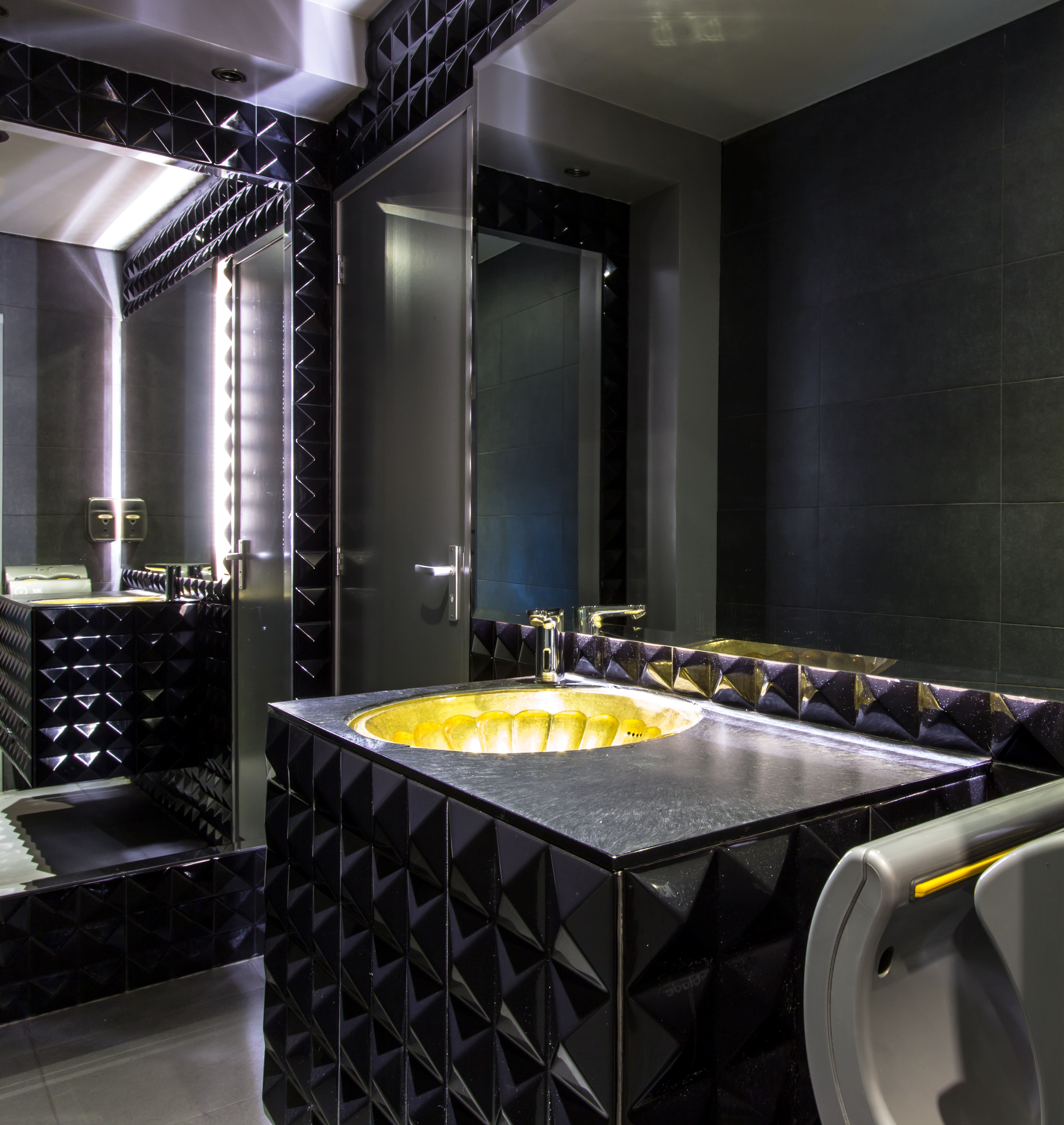 Anche il bagno non è da meno. Rivestito quasi interamente con piastrelle Black Keops, raggiunge una personalità innovativa. Vale la pena ricordare che i toni neri e lucidi che inondano Luminaa sono quelli che aiutano a spostarsi in un'altra sfera. Inoltre, l'uso di questo tipo di piastrelle rende palpabile nell'atmosfera l'estetica techno europea. Godiamocela!