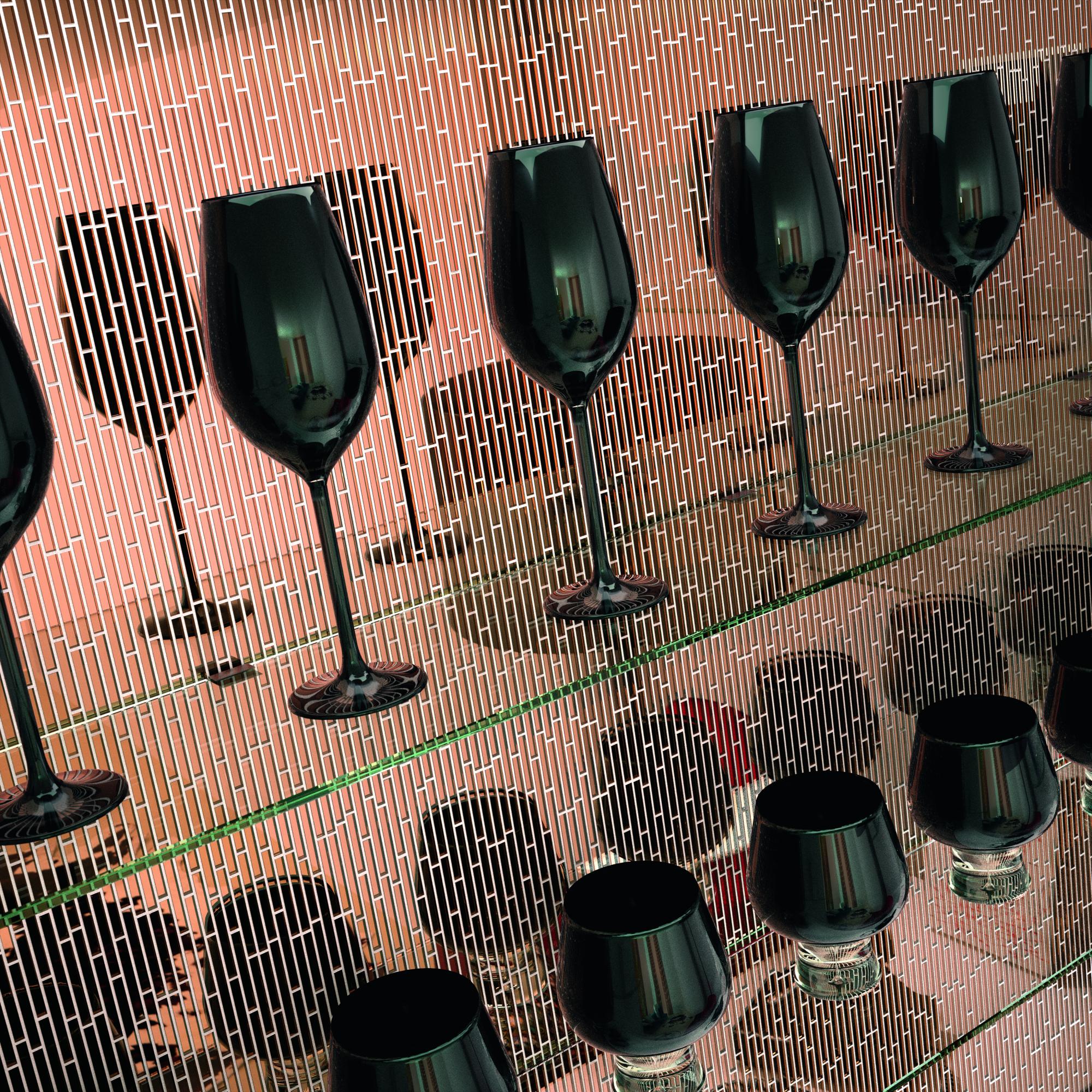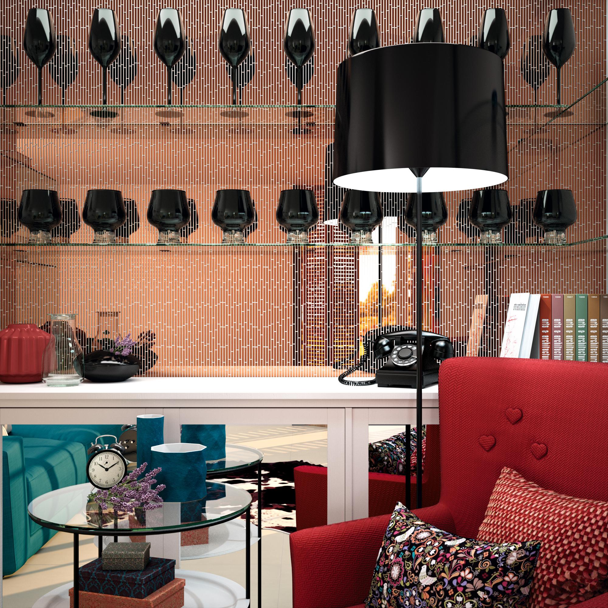 Sofisticado mosaico con espejo en cobre ideal para proporcionar sensación de amplitud.