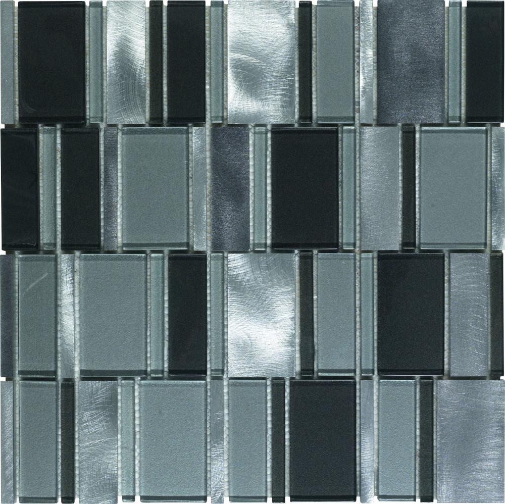 Sofisticado mosaico en cristal en tonos grises y plata con aluminio cepillado efecto metal. Se puede combinar con bases cementosas o blanco.