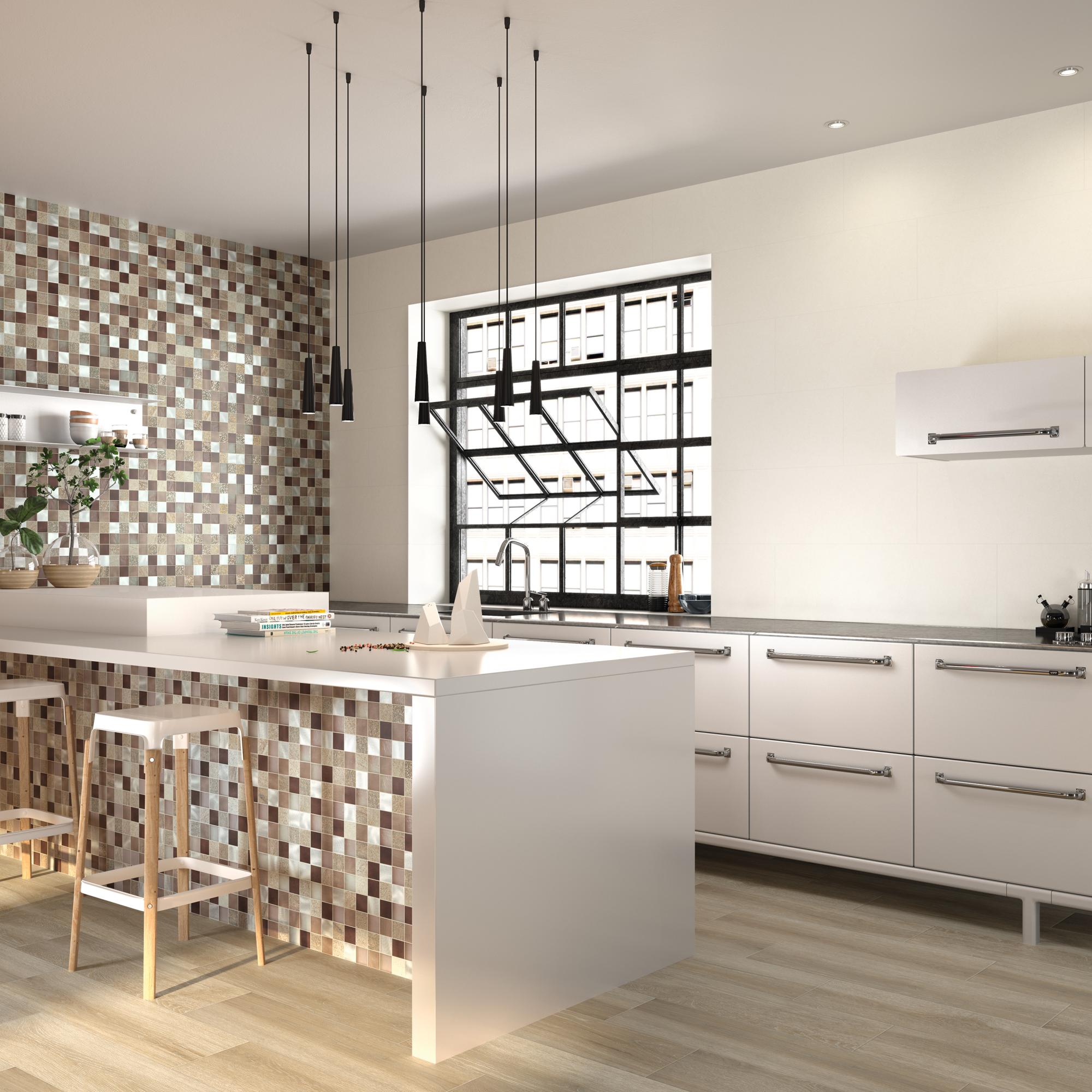 Mosaico de fusión: acero, cristal envejecido y una original piedra que destaca por los destellos de las micas. También en versión Grey, en tonos más fríos.