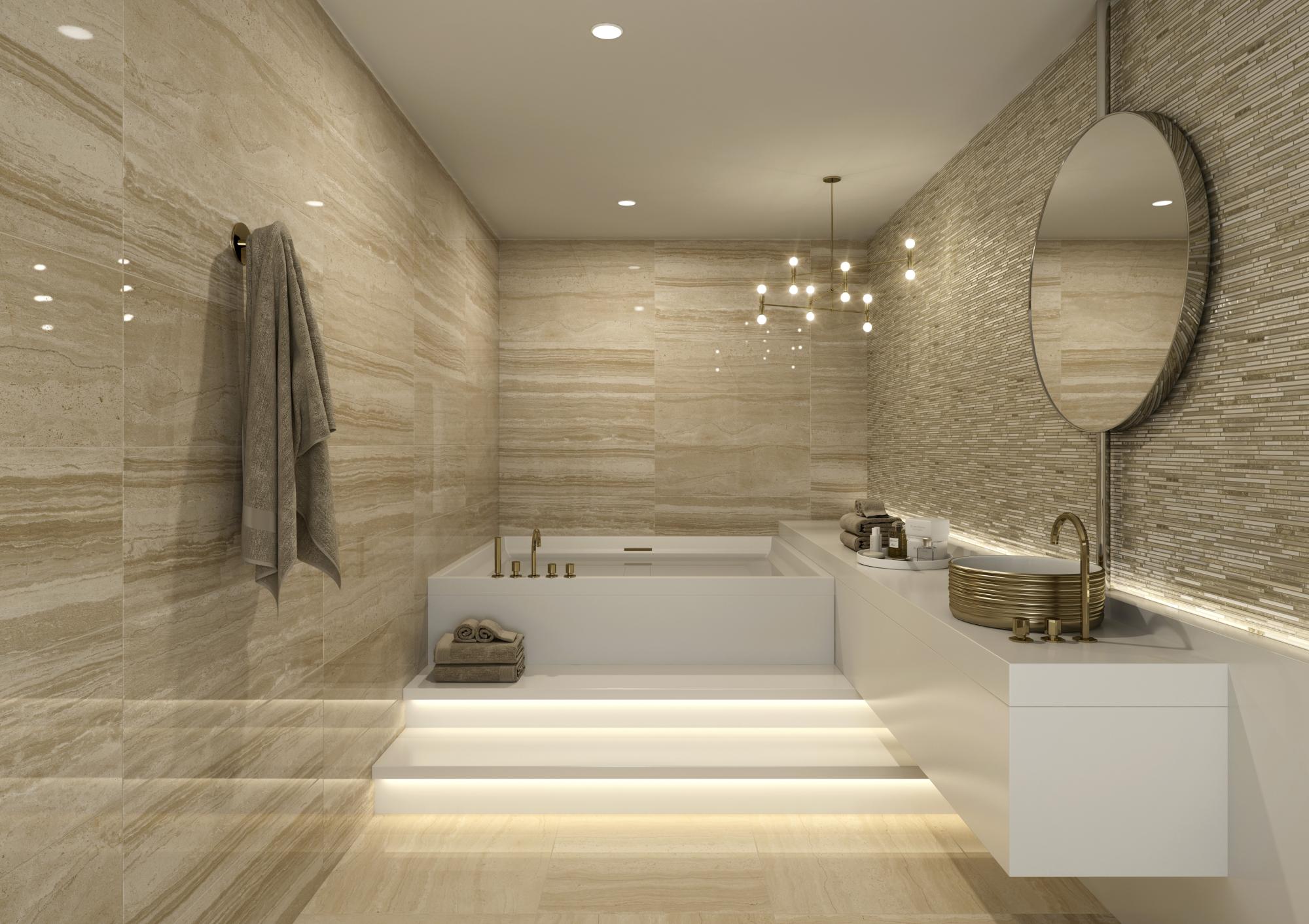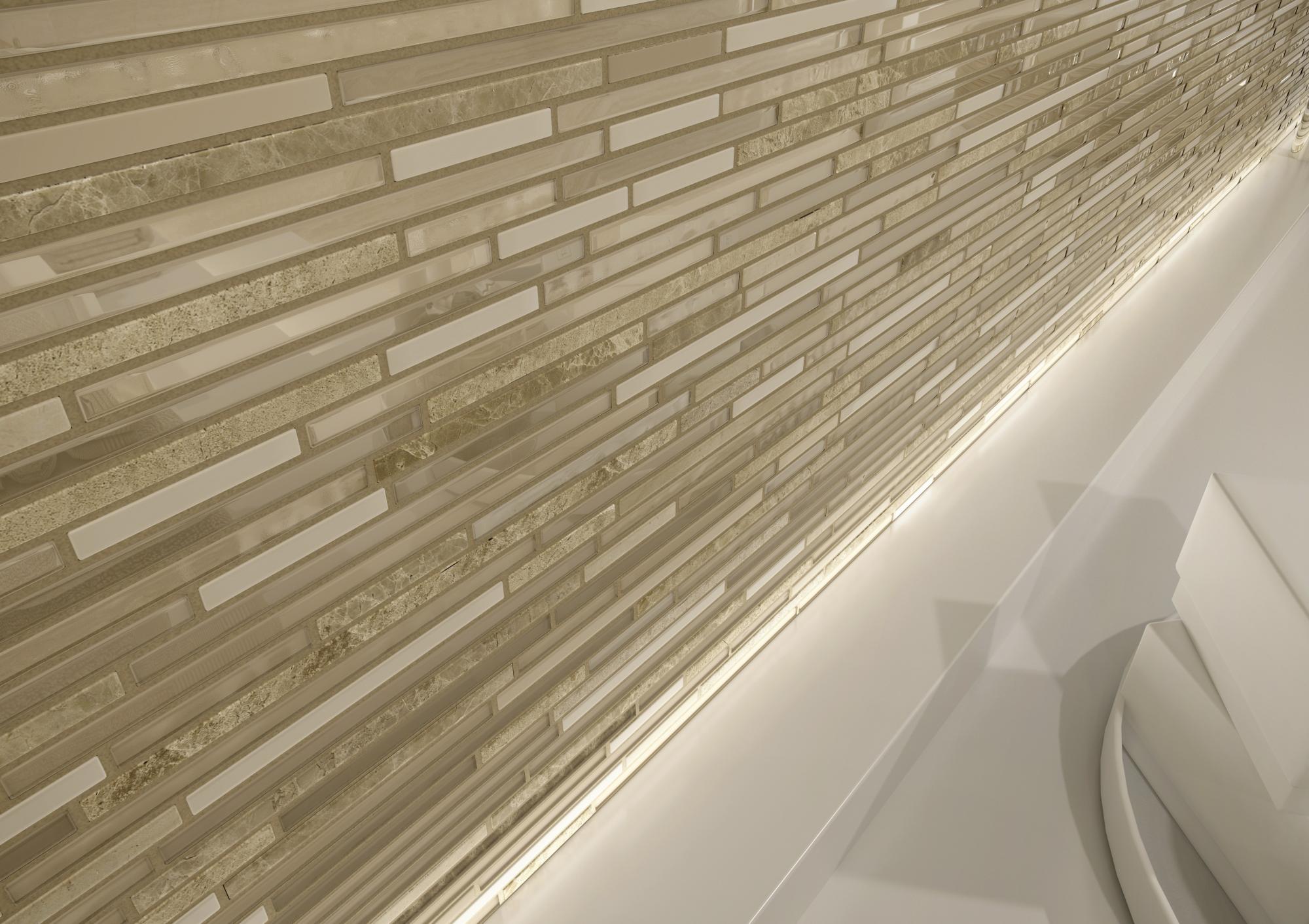 Mosaico de piedra y cristal en tonos cálidos de la gama del marfil y del crema. Superficies brillantes y mates para combinar con un sinfín de azulejos.