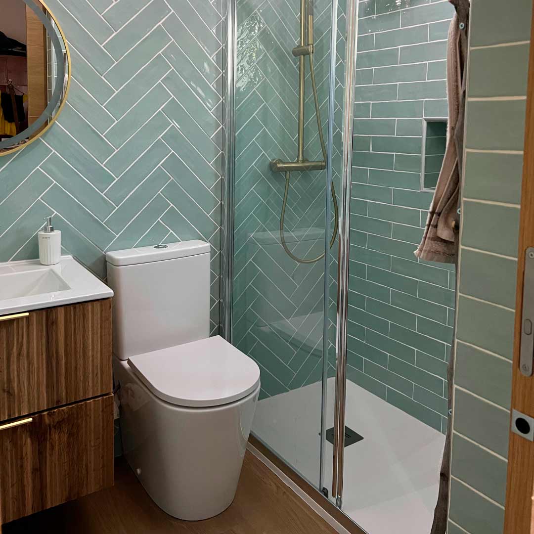 Un baño acogedor, elegante y mediterráneo, donde el verde aguamarina de nuestro azulejo Altea Anis se convierte en el protagonista, aportando frescura y personalidad al espacio.