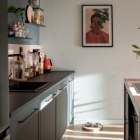 En esta cocina, diseñada por Anastasiia Lachugina, los azulejos Berlin Flamingo Matt se convierten en el eje estético que define la atmósfera y dirige la mirada. Su rosa empolvado, sutil y envolvente, introduce una calidez que se percibe desde el primer instante. No es un rosa vibrante ni intenso, sino un tono delicado que recuerda a los matices del amanecer, a esa luz suave que ilumina sin imponerse. Esta cualidad convierte al salpicadero en una superficie visualmente ligera, capaz de suavizar la robustez de los muebles en gris oscuro y equilibrar la fuerza del negro presente en las encimeras y elementos metálicos.