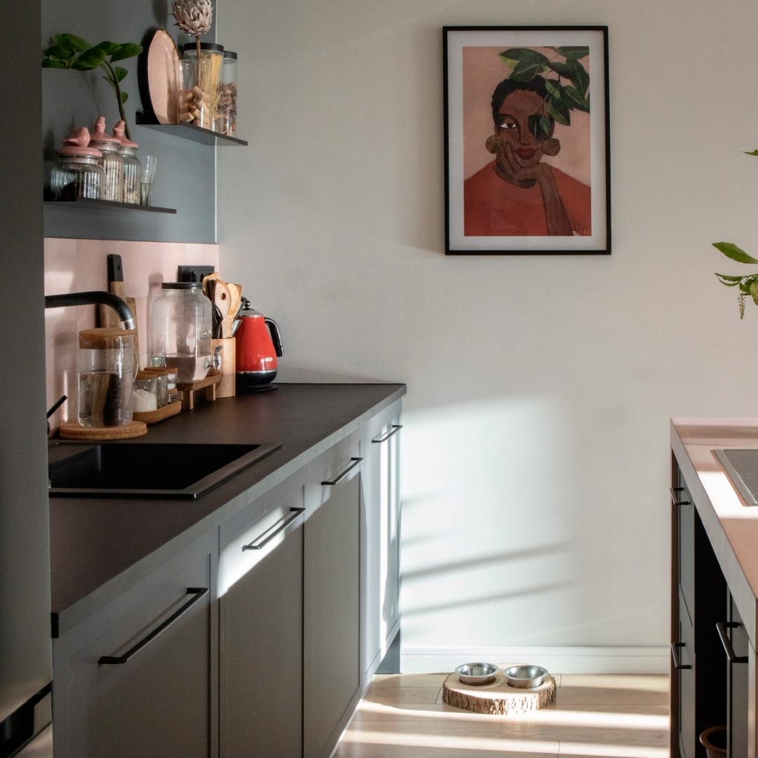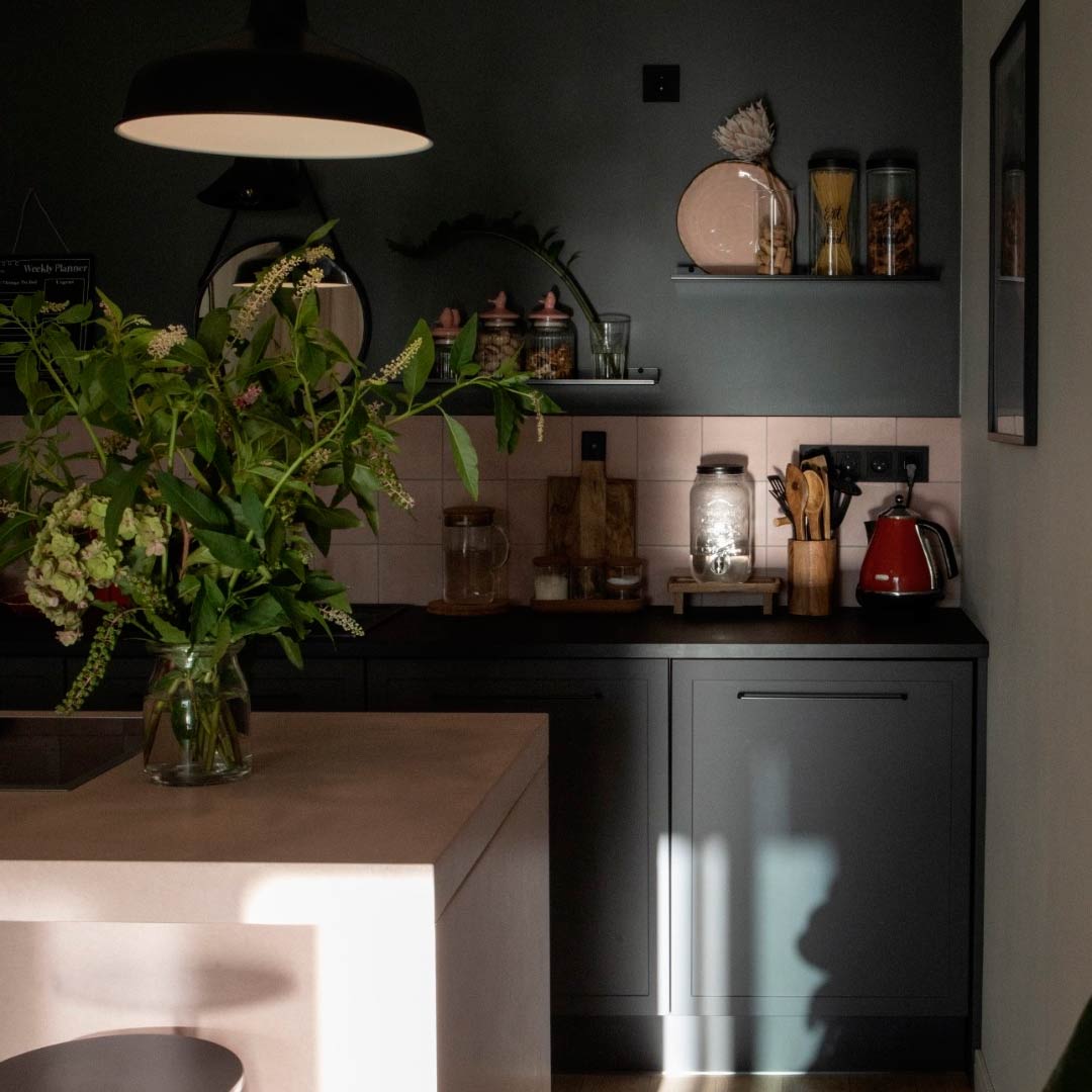 Una cocina contemporánea que encuentra su esencia con los azulejos rosas del salpicadero, que transforman por completo el ambiente. Su presencia aporta luminosidad, serenidad y una nota delicada y sofisticada que contrasta con los muebles en gris profundo y la encimera oscura. La combinación crea un equilibrio visual perfecto entre modernidad y calidez, suavizando las líneas rectas y los tonos neutros del conjunto.