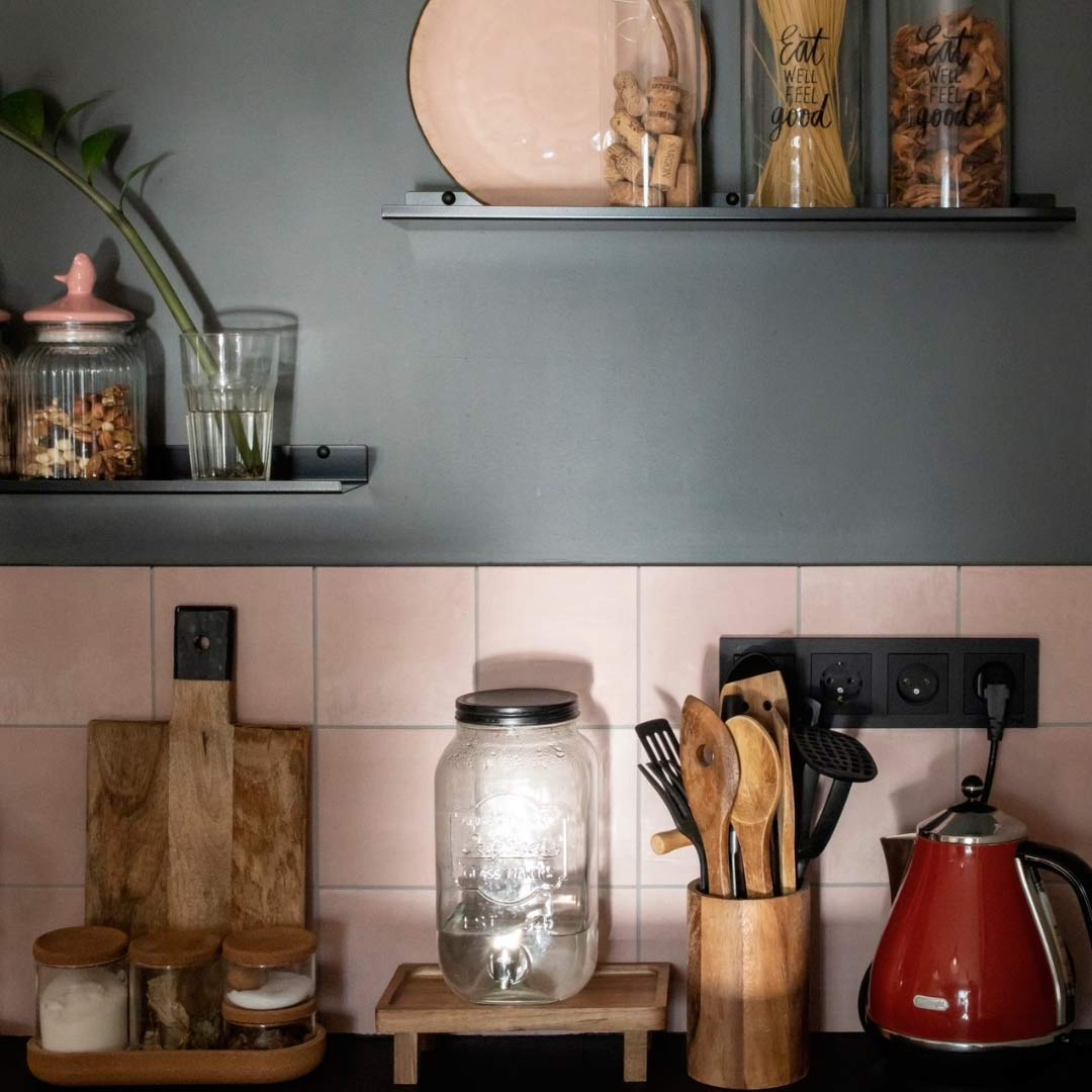La disposición lineal y ordenada de los azulejos crea un ritmo suave que acompaña la funcionalidad de la zona de trabajo. Desde la zona del fregadero hasta el rincón donde descansan los utensilios y pequeños electrodomésticos, los azulejos actúan como telón de fondo unificador. Su tonalidad rosa contrasta de forma muy elegante con el resto de elementos, aportando cohesión al conjunto.