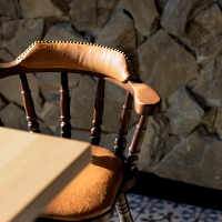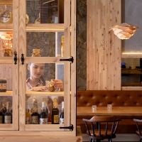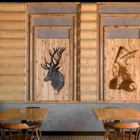 Diferentes tipos de madera, acabados y usos hacen que se potencie la sensación de estar en un ambiente montañoso y rústico. Sin duda un ambiente que nos recuerda a las posadas montañosas. La madera, no solo reviste algunos suelos y paredes, sino que también se utiliza en mobiliario y decoración.