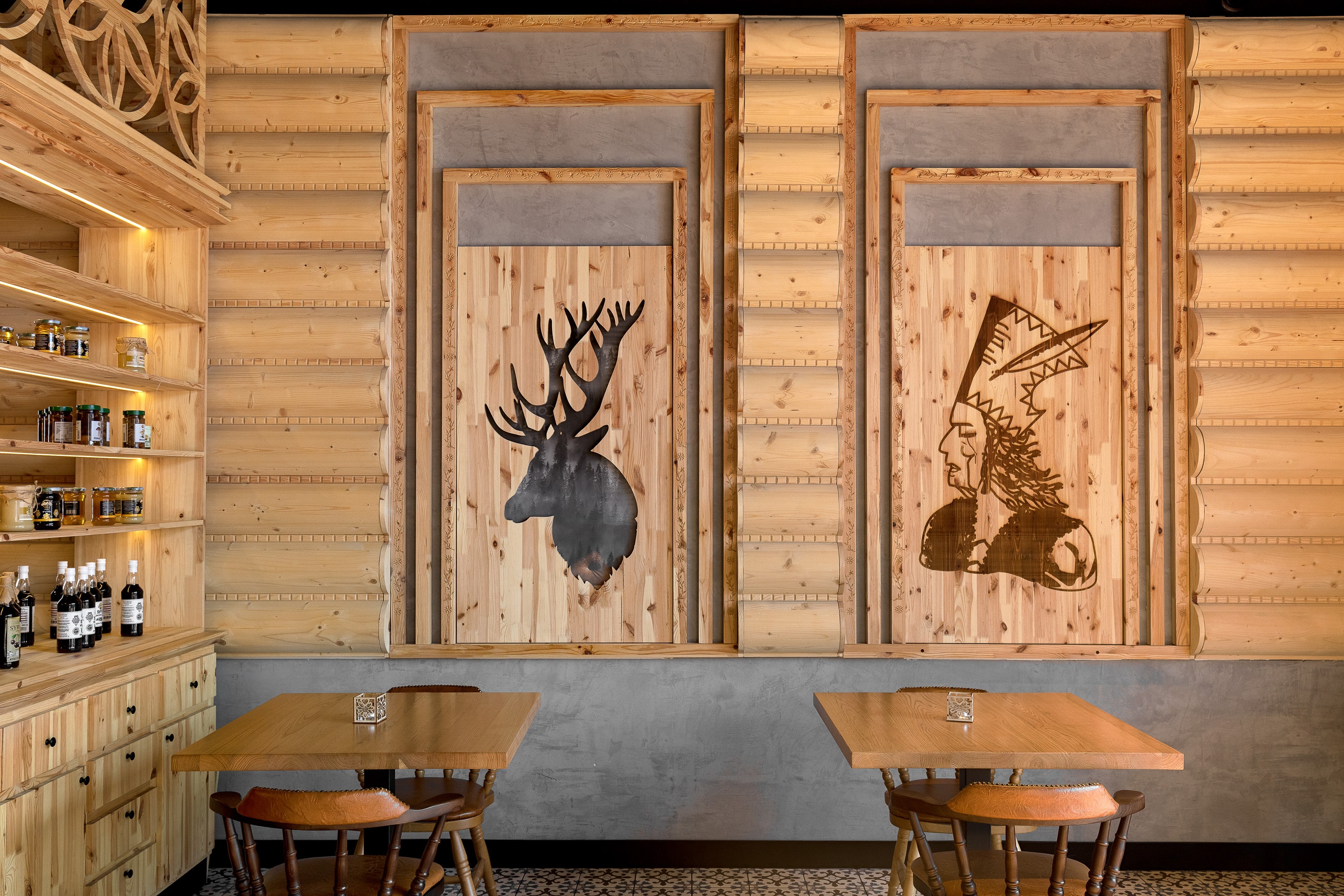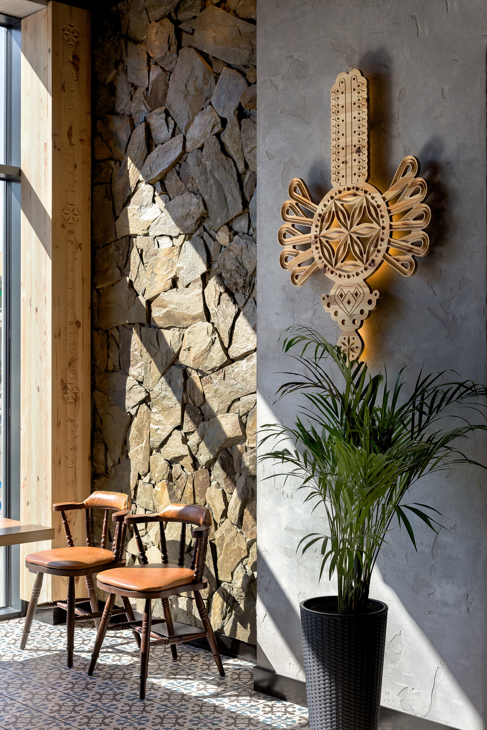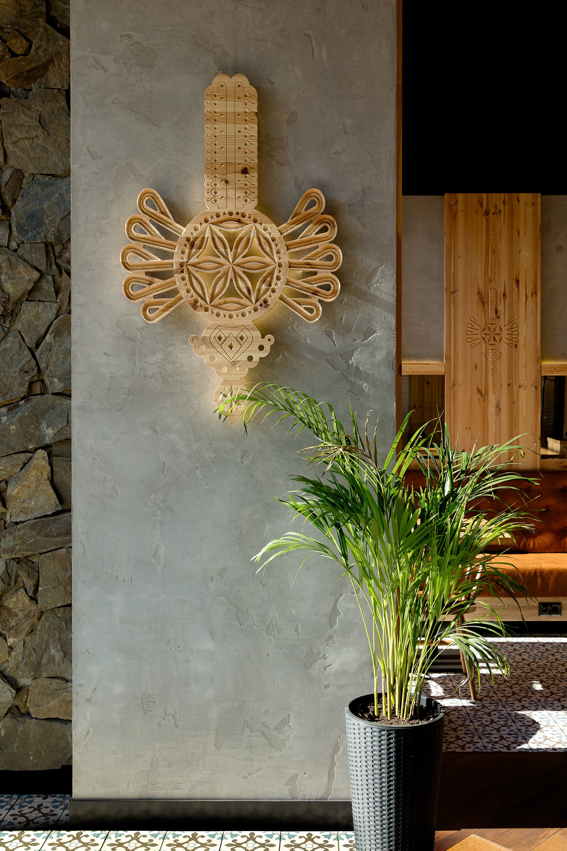 Cabe destacar los parzenice (motivos tradicionales de Podhale) y los símbolos del ciervo y el indio tallados en la madera como elementos decorativos principales. Esta técnica de talla en madera se ha convertido en parte integrante de todo el proyecto. Y es que podemos encontrar parzenice tanto en la ornamentación de muebles como en los elementos arquitectónicos, las decoraciones murales y los bajorrelieves.