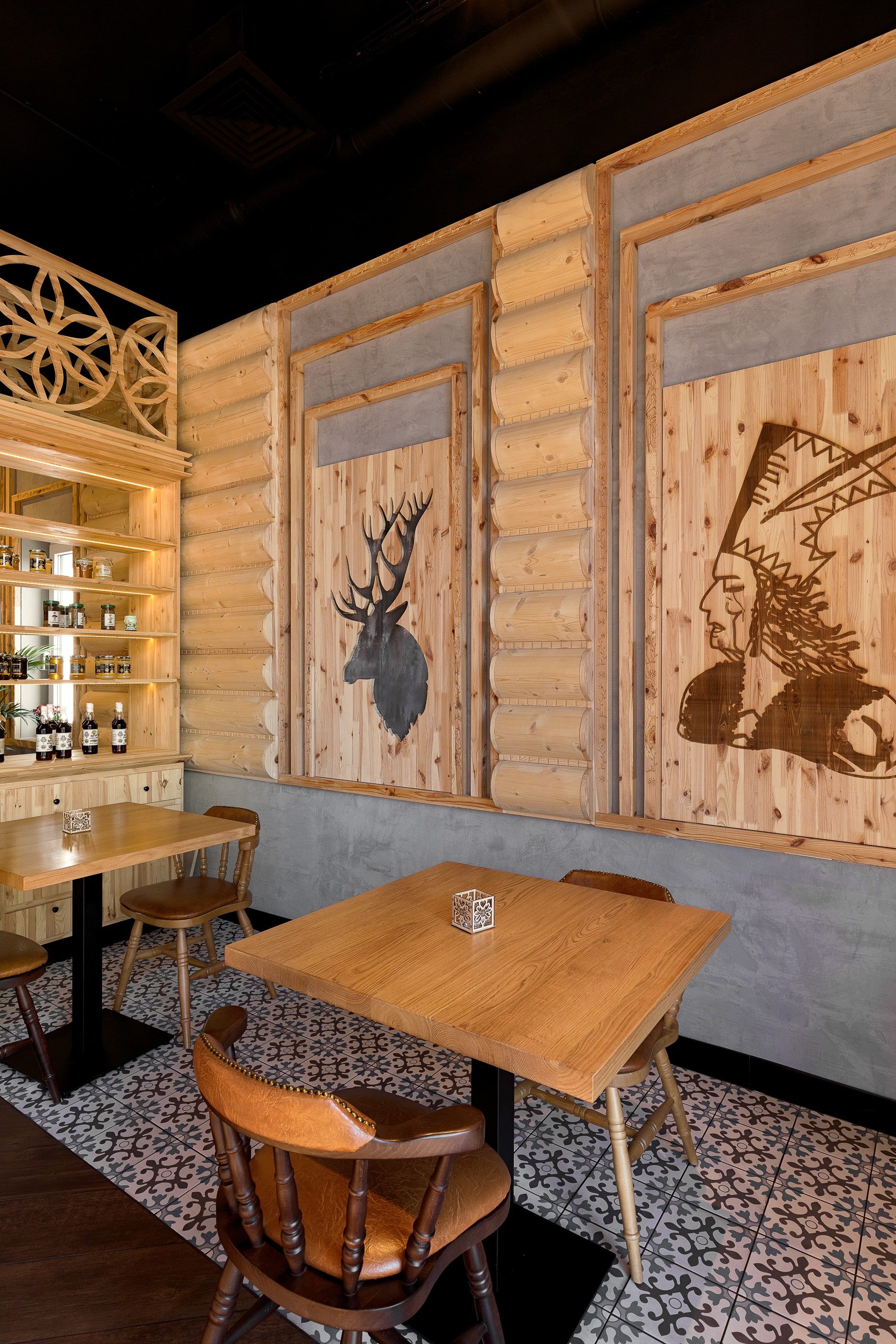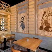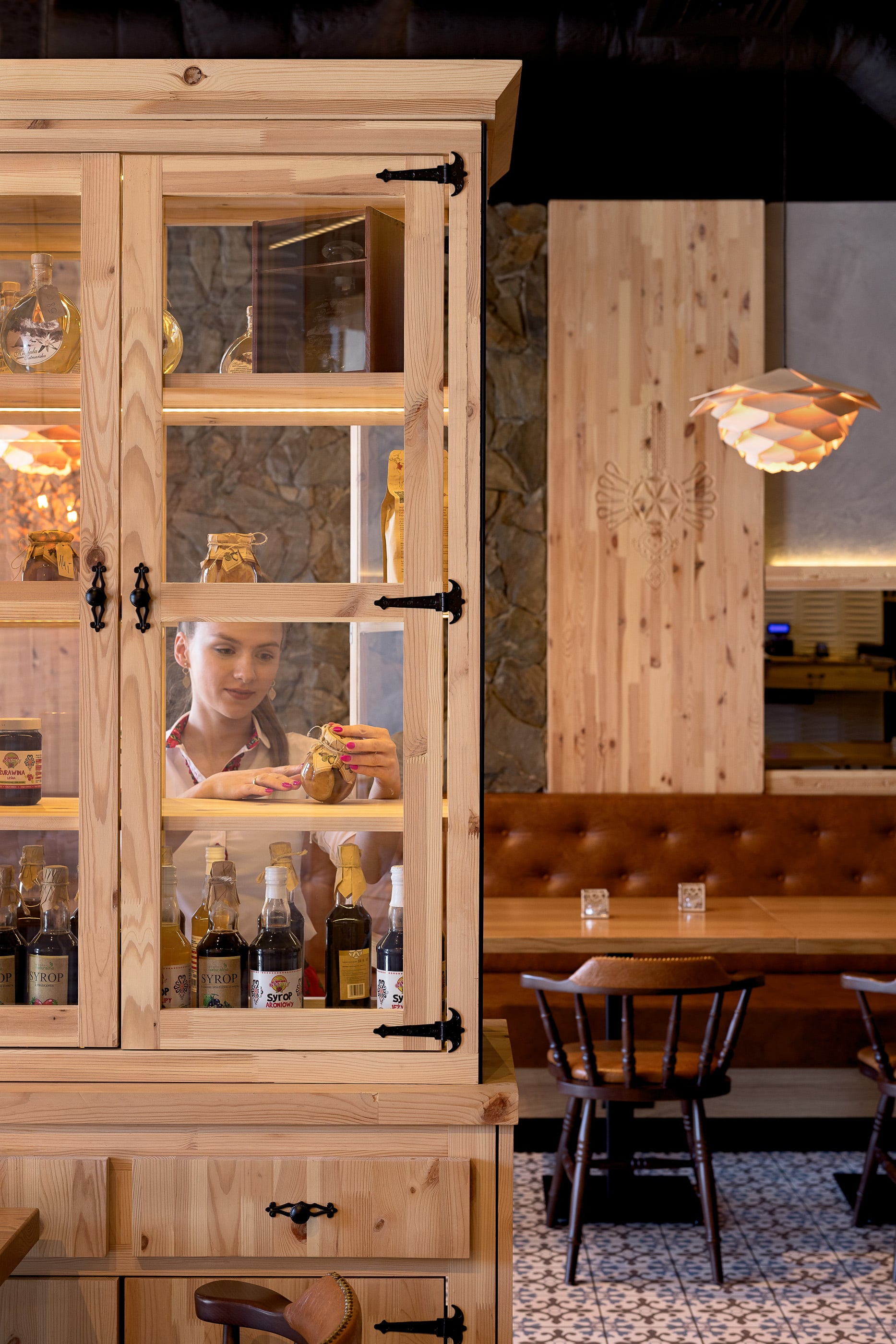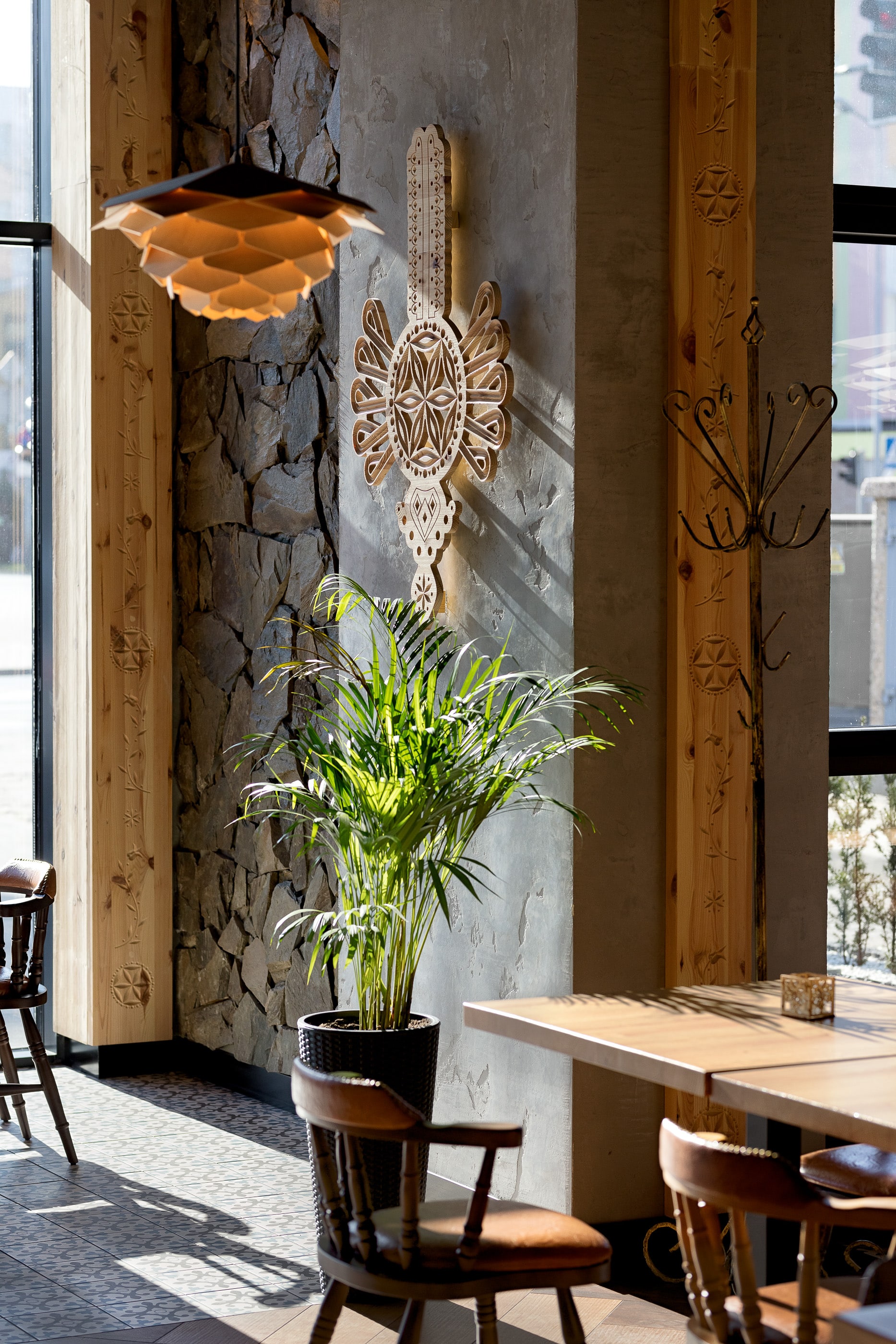 Cabe destacar los parzenice (motivos tradicionales de Podhale) y los símbolos del ciervo y el indio tallados en la madera como elementos decorativos principales. Esta técnica de talla en madera se ha convertido en parte integrante de todo el proyecto. Y es que podemos encontrar parzenice tanto en la ornamentación de muebles como en los elementos arquitectónicos, las decoraciones murales y los bajorrelieves.