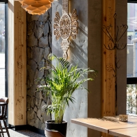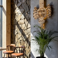 La piedra y el hormigón han revestido también muchas de las paredes del Corno Izba dotándolo de personalidad y estética. Además, también se han utilizado plantas naturales y se ha jugado con la luz para potenciar ese ambiente montañoso que tanto se ha buscado recrear.