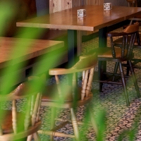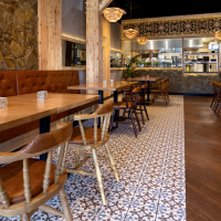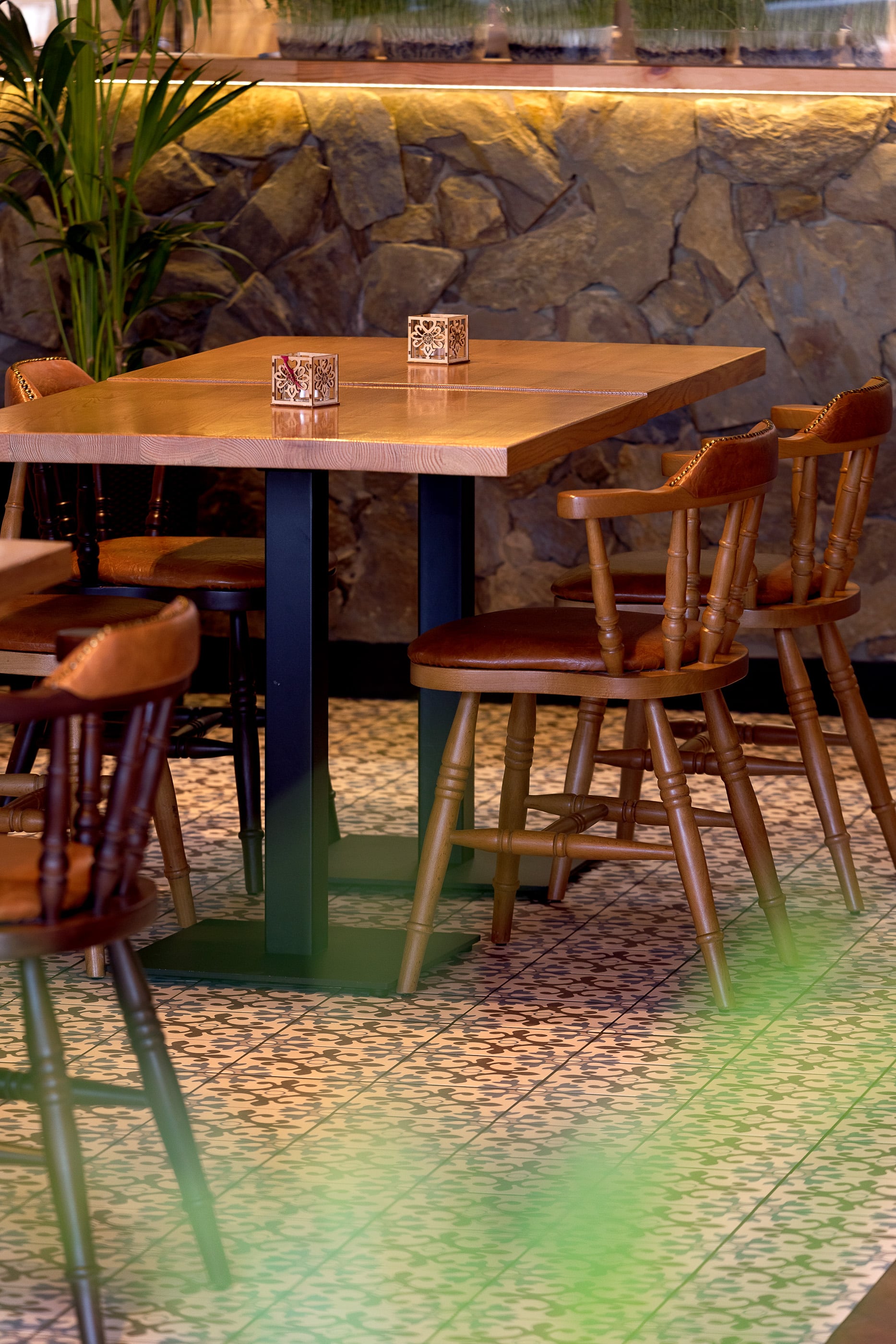 La colección Saudade, al igual que las bases de este proyecto, también se inspira en lo tradicional y combina con el estilo moderno gracias a sus gráficas de aire atemporal. La mejor forma para emplear sus piezas es creando alfombras que aporten carisma y detalle al proyecto. Por ello, el estudio ARTPIN ha empleado la pieza Porto para revestir la parte de las mesas. Así consigue dar ese estilo alfombra que resulta tan acogedor.