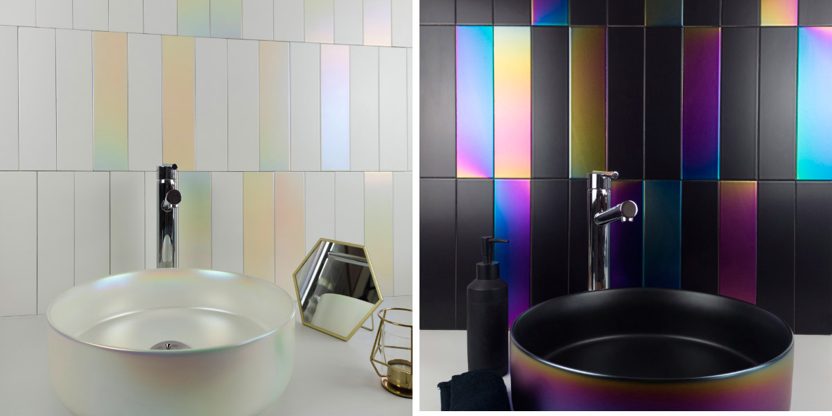 Вы можете использовать керамическую плитку с геометрическими формами, прямыми линиями и яркими оттенками, такими как бирюзовый или фуксия, или даже использовать иридисцентную и металлическую плитку, которая добавляет футуристический акцент и отражает свет инновационными способами. Плитка позволяет создавать визуальные акценты на стенах или полах, которые объединяют ностальгию с технологией, создавая интересный и современный контраст.