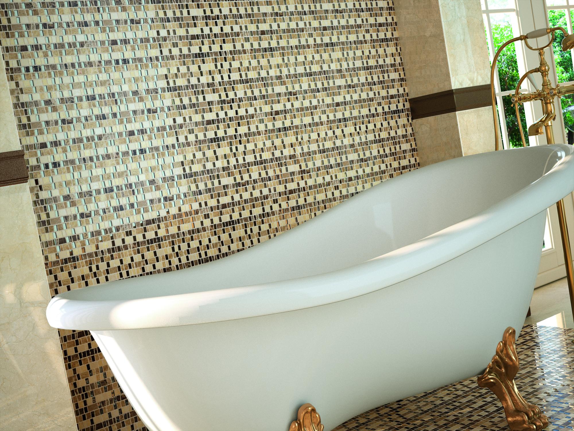 Мозаика в артезанальном стиле со смесью смальтов нерегулярной формы из мрамора имперадор и зеркальной меди.