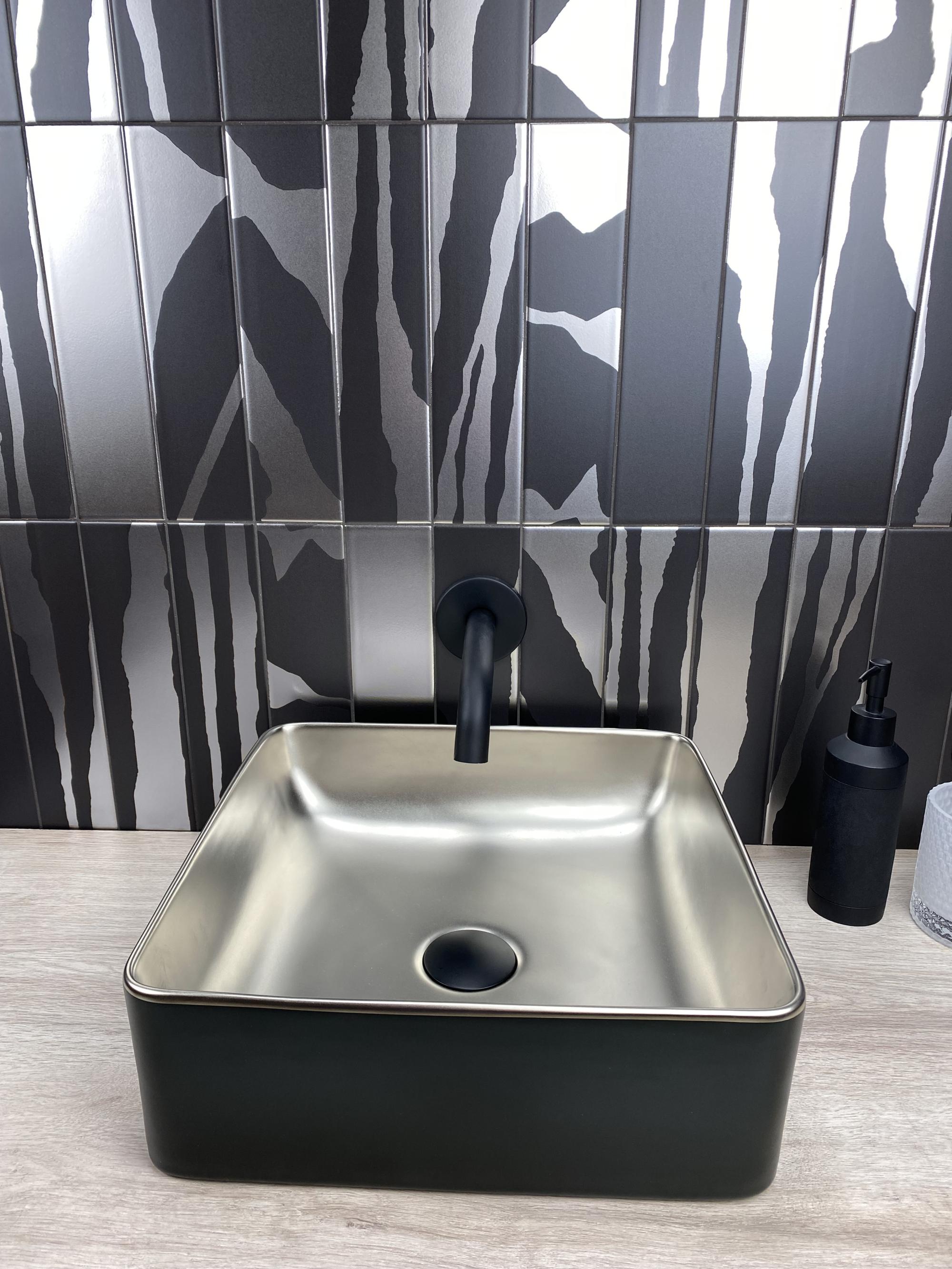 Умывальник из PVD квадратного формата с мягкой матовой поверхностью. Его утонченный внешний вид достигается благодаря двухцветному дизайну и тонким линиям. Внутренняя часть серебристого цвета, а внешняя — черная, а край, на котором металлический цвет создает эффект перелива, выделяется. Раковина – яркий пример роскоши и изысканности. Раковина имеет соответствующий клапан.