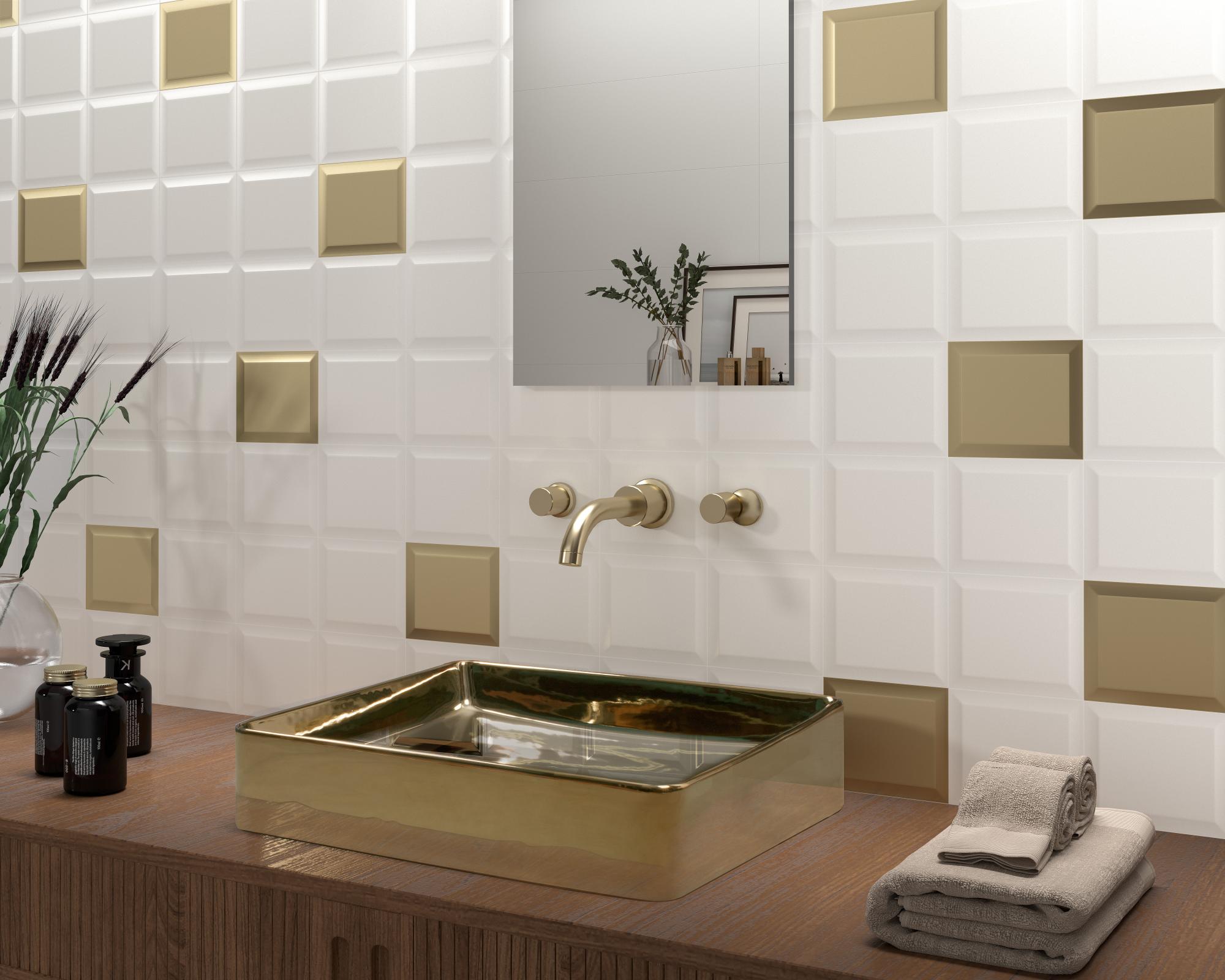 Современный прямоугольный умывальник с тонкими стенами и металлизированной отделкой из PVD. Прекрасное дополнение для оформления любой ванной, наделяющего его стилем и утонченностью.
