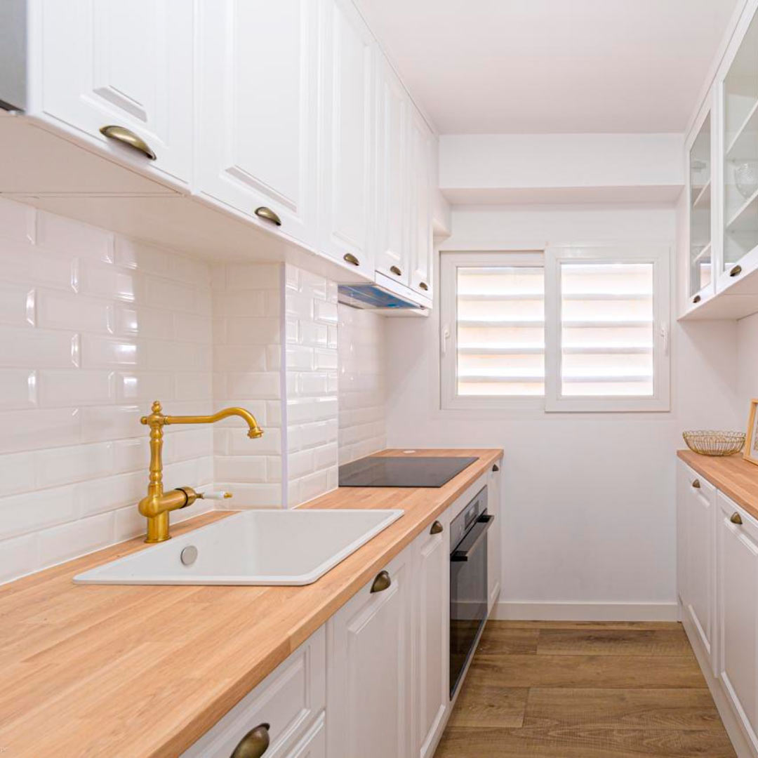 С другой стороны, кухня, которая дышит гораздо более урбанистическим деревенским воздухом, выделяется своей теплотой, которая достигается благодаря всегда безошибочному сочетанию дерева и белого цвета. Наша подземная плитка на верхней стене вместе с нашим виниловым напольным покрытием последнего поколения SPC со 100% водонепроницаемой и высокопрочной минеральной сердцевиной придают тот домашний уют, который так необходим частному дому.