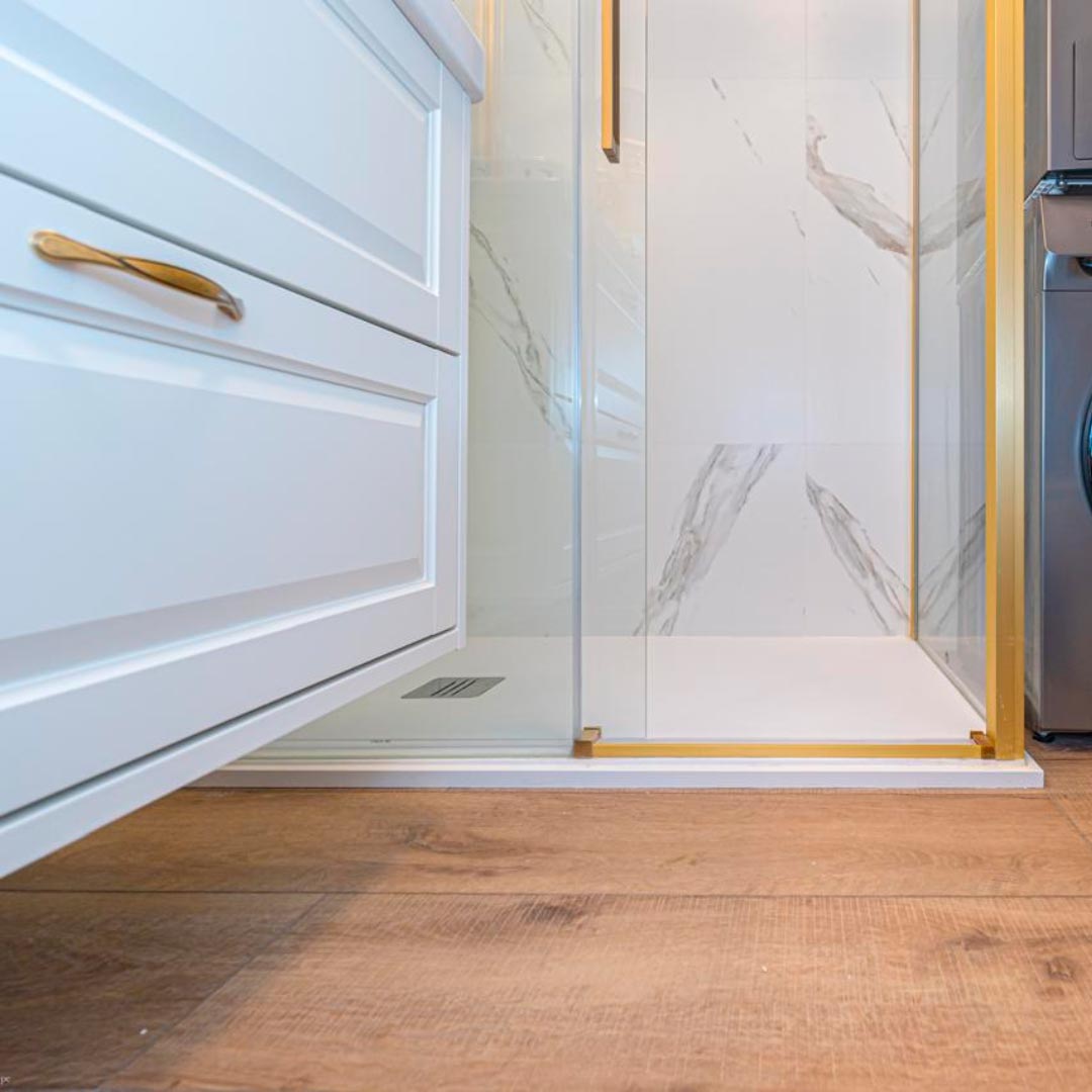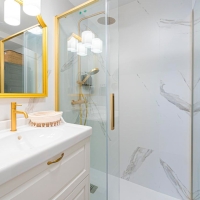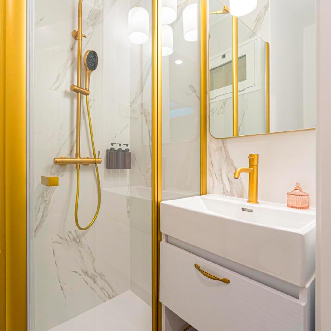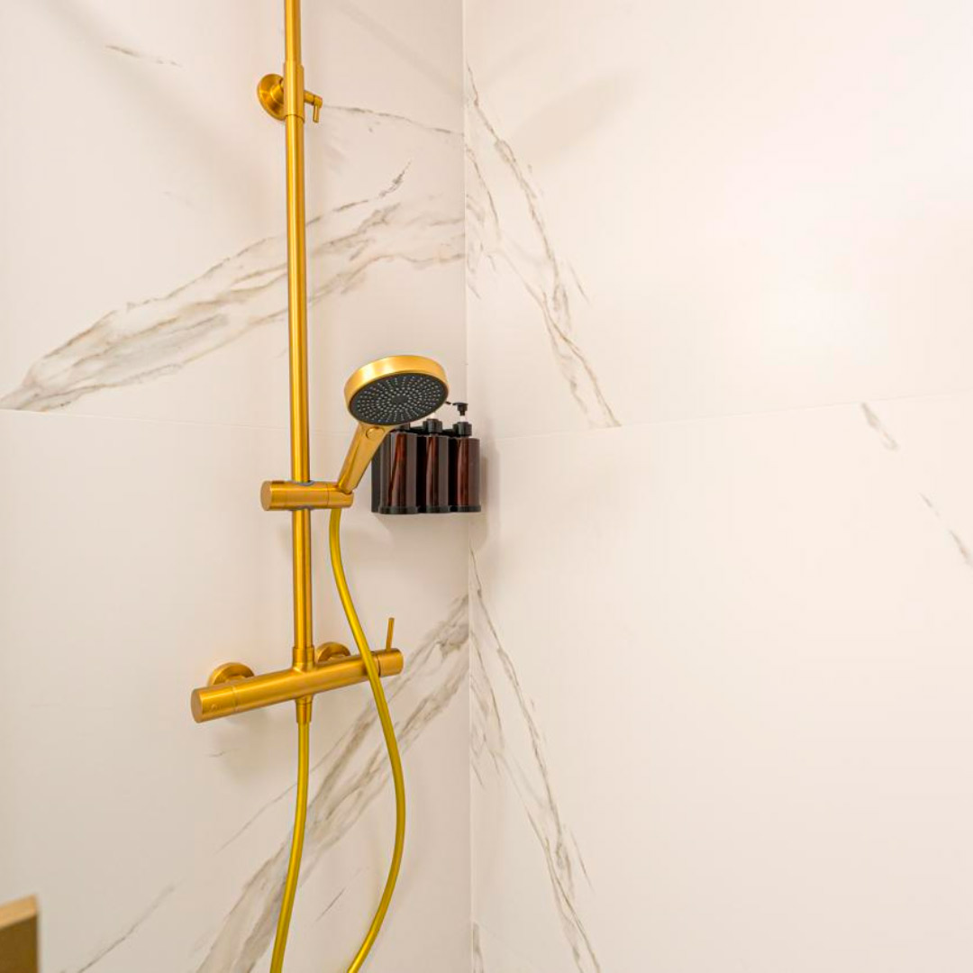 Этот стиль достигается благодаря сочетанию различных декоративных элементов. С одной стороны, современную элегантность подчеркивают линии мебели, а также золотые детали в кранах, зеркалах, ширмах и светильниках. А также наша плитка Calacatta Superwhite Satin, которая благодаря своему мраморному эффекту очень органично вводит эту красоту в ванную комнату.