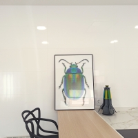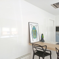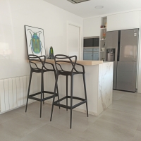 На кухне стены тоже покрыты белой плиткой. Белая глянцевая плитка усиливает ощущение чистоты, а кухонная мебель выделяется. Особенно это касается центрального острова, где современная эстетика табуретов привлекает внимание. Именно здесь вписывается средиземноморский стиль, который сопровождает весь дом. Благодаря картинам в синих и зеленых тонах и использованию плитки Calacatta Superwhite, стиль трех ванных комнат сливается в одном помещении.