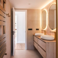 Мебель из натурального дерева добавляет тепло и баланс, создавая гармоничный контраст с керамическими поверхностями без потери эстетической целостности. Душевая зона, выполненная в более нейтральных тонах, органично вписывается в пространство, позволяя декоративной облицовке сохранять свою ведущую роль.