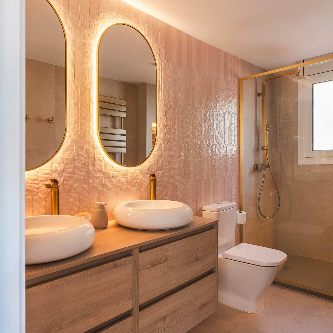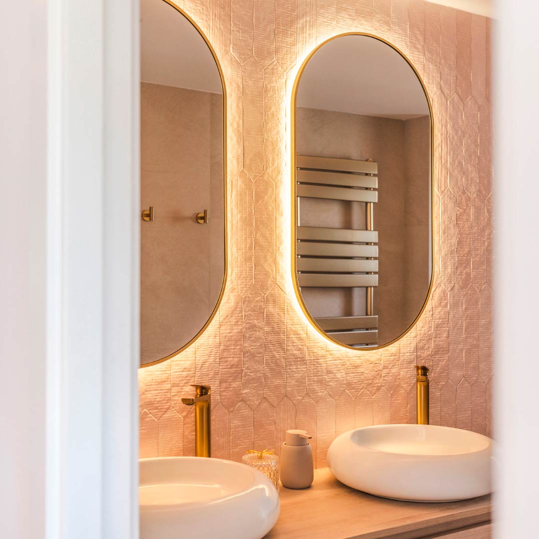 Розовая плитка на основной стене, наша Crackle Decor Camelia, становится настоящим главным элементом пространства, улавливая свет и превращая его в тёплое, обволакивающее сияние. Её тонкая текстура придаёт глубину и динамику, создавая изящную игру отражений, которая возвышает всю атмосферу. Это не просто облицовка — она служит светлым фоном, который подчёркивает зеркала, усиливает золотые акценты и придаёт интерьеру современный и изысканный характер.