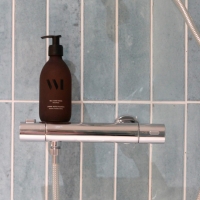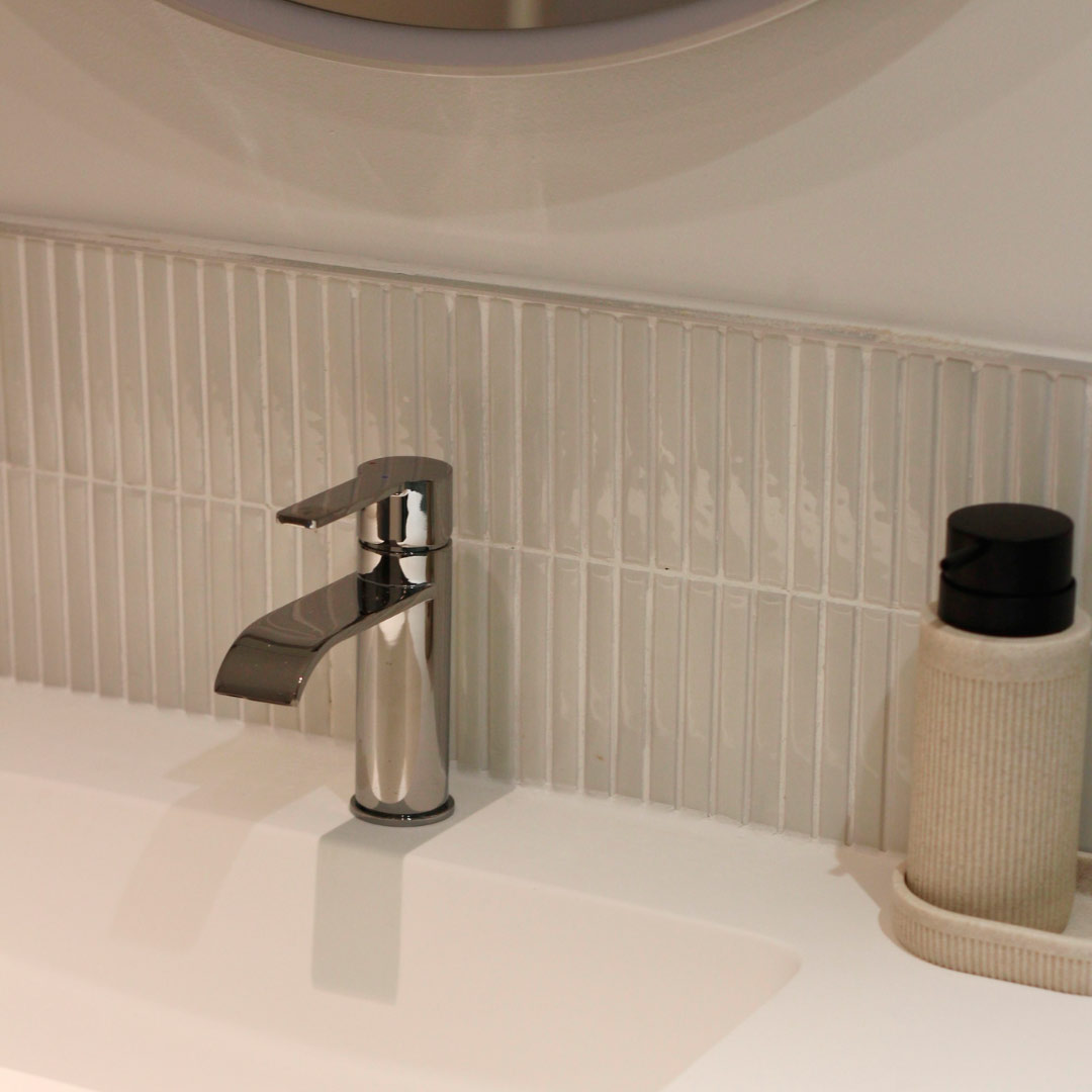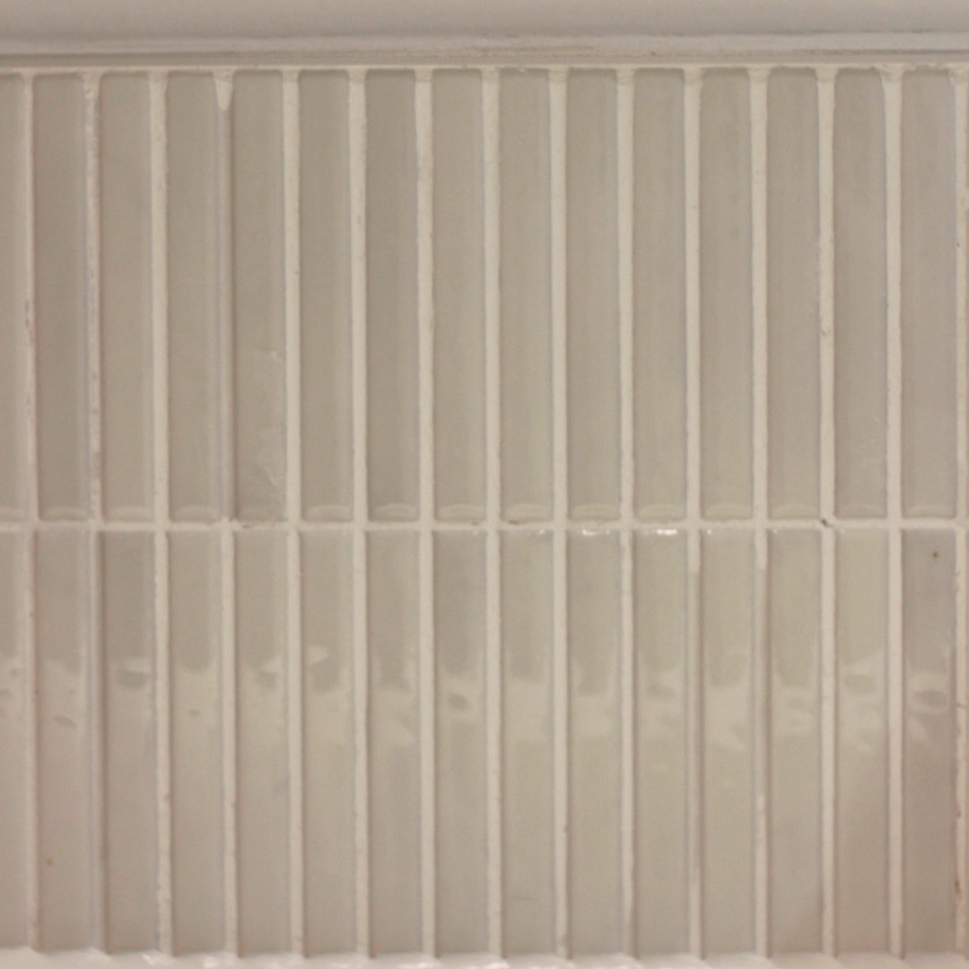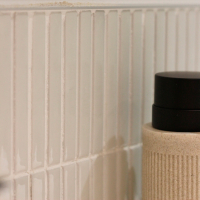 В контрасте зона умывальника оформлена с использованием Kit-Kat Snow Glossy — облицовки из узких и вытянутых элементов, которые создают тонкую и элегантную текстуру. Глянцевая поверхность отражает свет и усиливает общую освещённость, создавая ощущение чистоты и лёгкости.