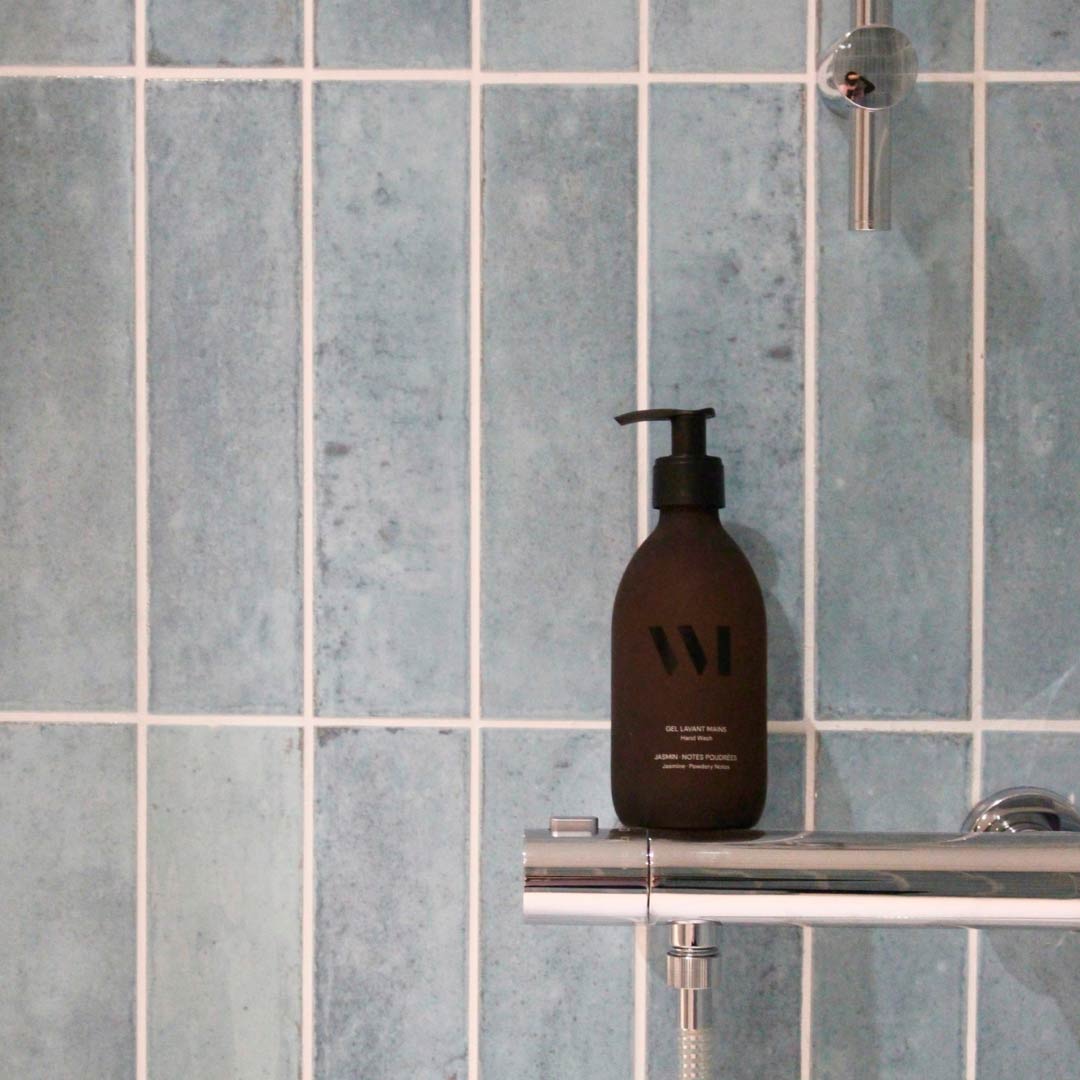 В зоне душа плитка Agadir Agua становится ключевым элементом. Её голубой оттенок, богатый нюансами, напоминает спокойствие воды и создаёт обволакивающую атмосферу, превращая душ в расслабляющее пространство. Каждая плитка имеет лёгкие цветовые вариации, создавая живую поверхность, на которой свет по-разному отражается в течение дня.