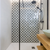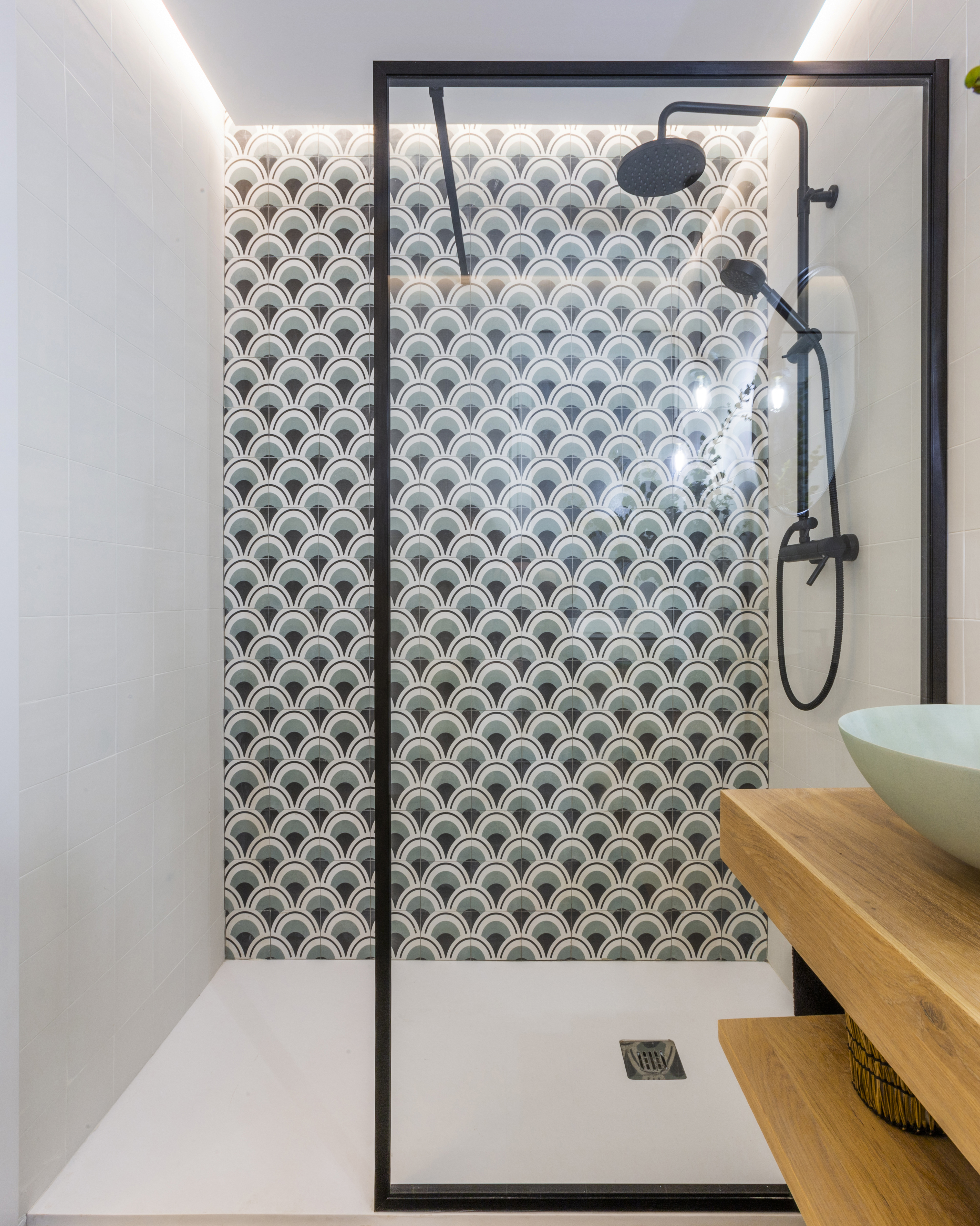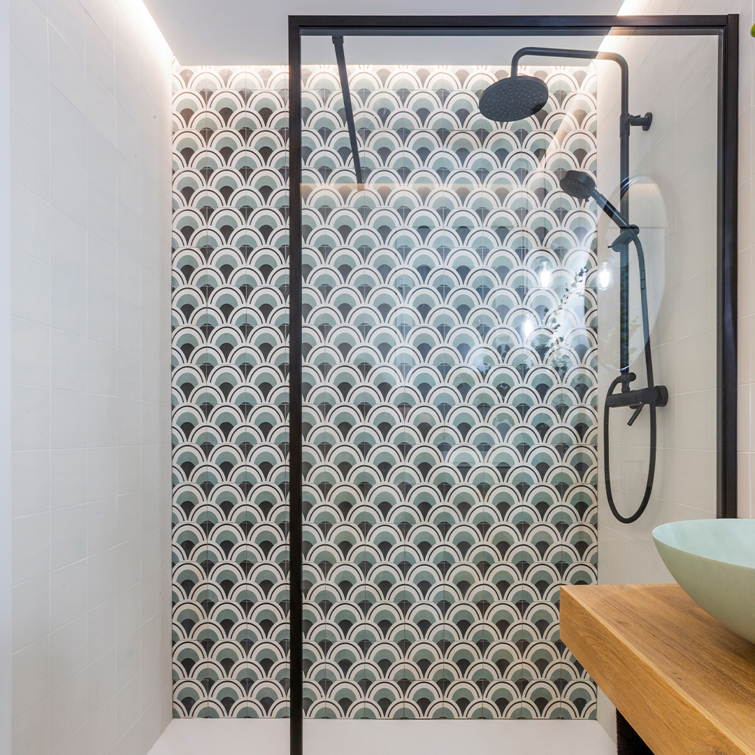 Плитка, использованная для облицовки центральной стены душевой, идеально подходит для придания смелой нотки этой ванной комнате. Плитка Marina призвана объединить и придать уютный вид любому помещению. Кроме того, благодаря геометрическому дизайну чешуек она позволяет создавать бесконечные композиции.