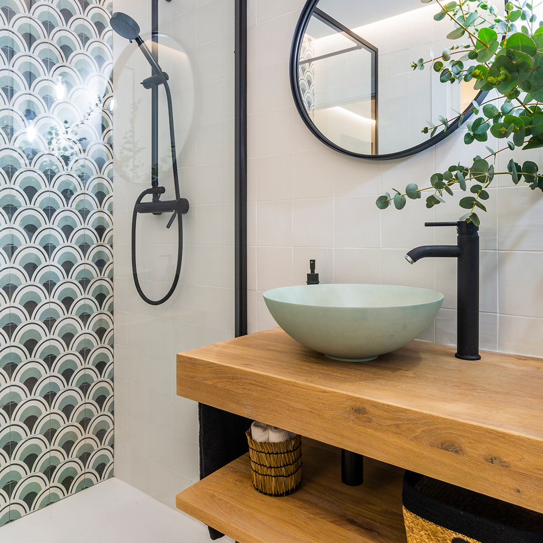 Теплые тона и природные элементы привносят свет и жизнь в эту ванную комнату, расположенную в центре Валенсии.