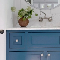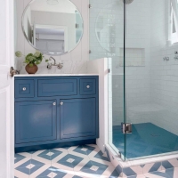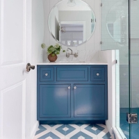 Изюминкой дизайна является использование глубокого, яркого синего цвета на туалетном столике. Этот цвет прекрасно контрастирует с остальной нейтральной палитрой, преобладающей в ванной комнате. В то время как белые стены, рама зеркала и душевая кабина создают ощущение простора и света, синий цвет служит для создания ощущения глубины и характера, выступая в качестве фокусной точки.