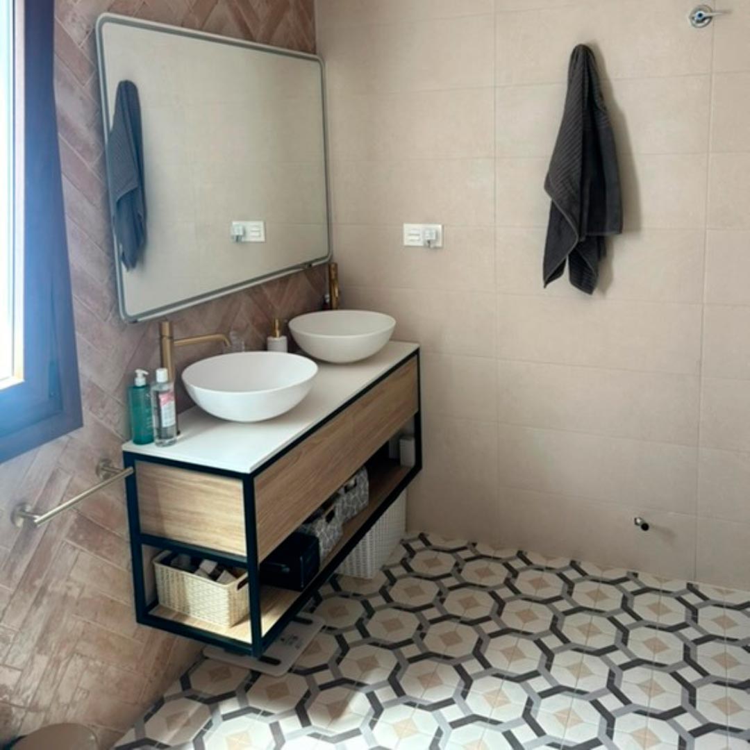 Выбранная плитка для пола, модель Viana, создает интересный геометрический контраст, придающий помещению индивидуальность. Ее шестиугольные формы и мягкие оттенки бежевого, серого и песочного цвета идеально гармонируют с облицовкой, придавая ансамблю равновесие и эстетическую целостность. Результатом является современная и функциональная ванная комната, где плитка становится настоящей звездой дизайна, полного характера и вневременной элегантности.