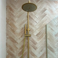 В этой ванной комнате сочетание материалов, текстур и нейтральных оттенков создает теплую и уютную атмосферу, не отказываясь от современного стиля. Главную роль играет модель Agadir Arena, использованная в качестве основной облицовки и уложенная в виде елочки, что придает стенам динамизм и визуальное движение. Ее глянцевая поверхность и цветовая вариация напоминают текстуру ручной работы zellige, создавая естественный и обволакивающий эффект.
