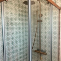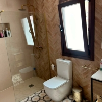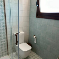 Вторая ванная комната, отделанная плиткой из серии Valencia, отличается гармоничным сочетанием плитки и материалов, создающих естественную, свежую и уютную атмосферу. Стена душевой кабины облицована гидравлической плиткой в оттенках мятно-зеленого и белого с повторяющимся геометрическим узором, который придает визуальную динамику, не перегружая пространство. Этот узор уравновешивается гладкими стенами, облицованными квадратной плиткой в нейтральных и мягких тонах, которые идеально сочетаются с гидравлическим дизайном.
